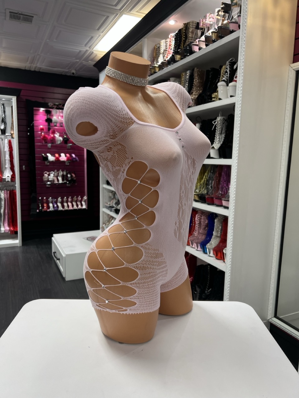 Side cutouts with crisscross fishnet detail