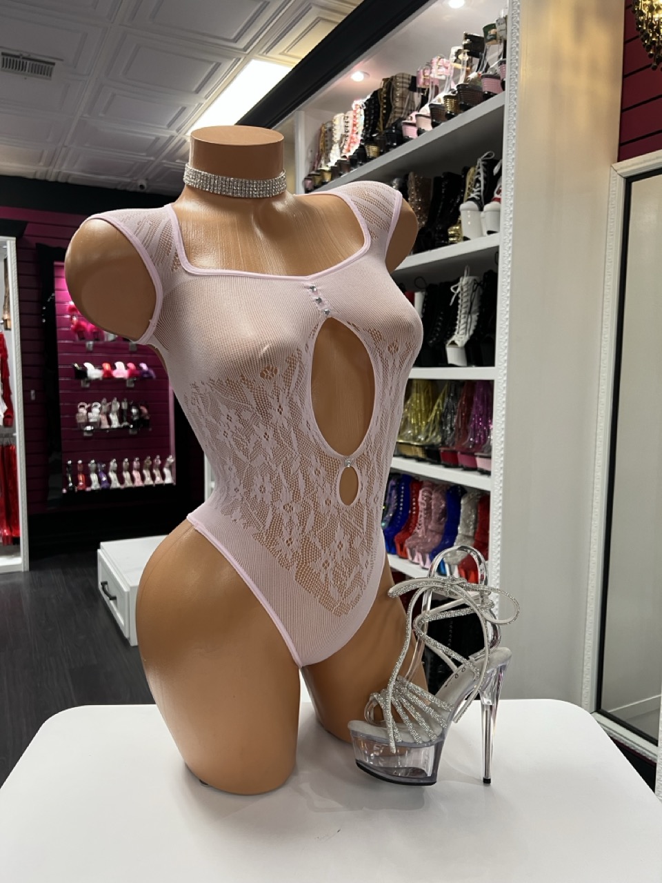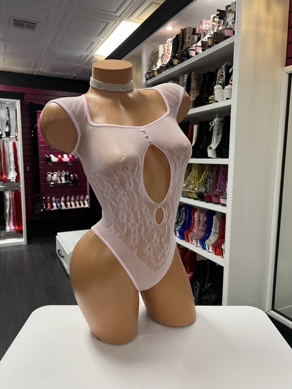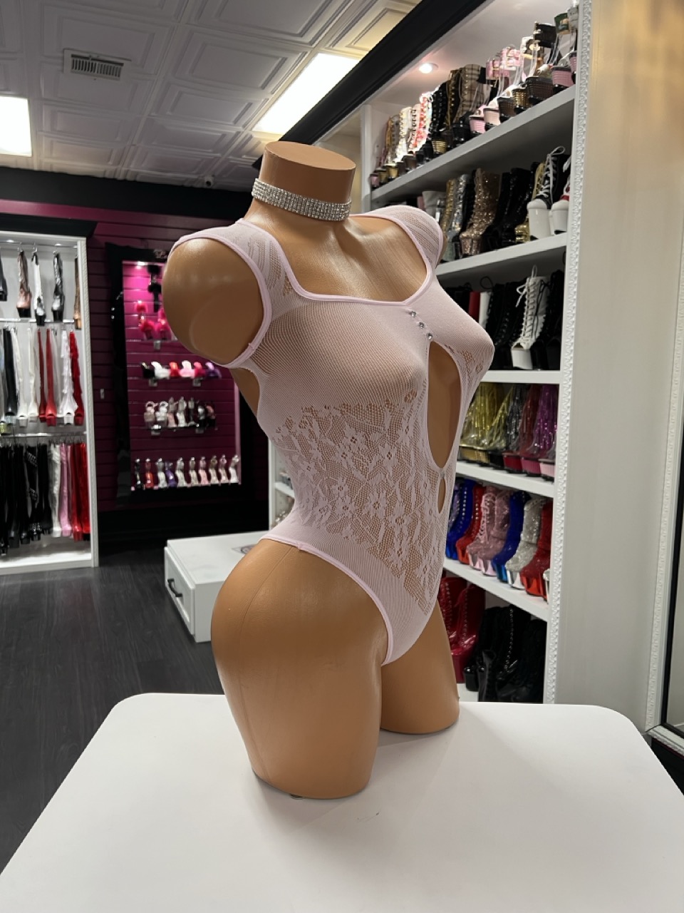 Dare to bare in this sultry blush pink fishnet bodysuit featuring a bold keyhole front and delicate lace-inspired detailing. Soft, stretchy, and breathable, this one-piece hugs the body in all the right places. Finished with a faux gem accent at the chest, it’s perfect for dancers, lingerie lovers, and nightlife icons alike.
