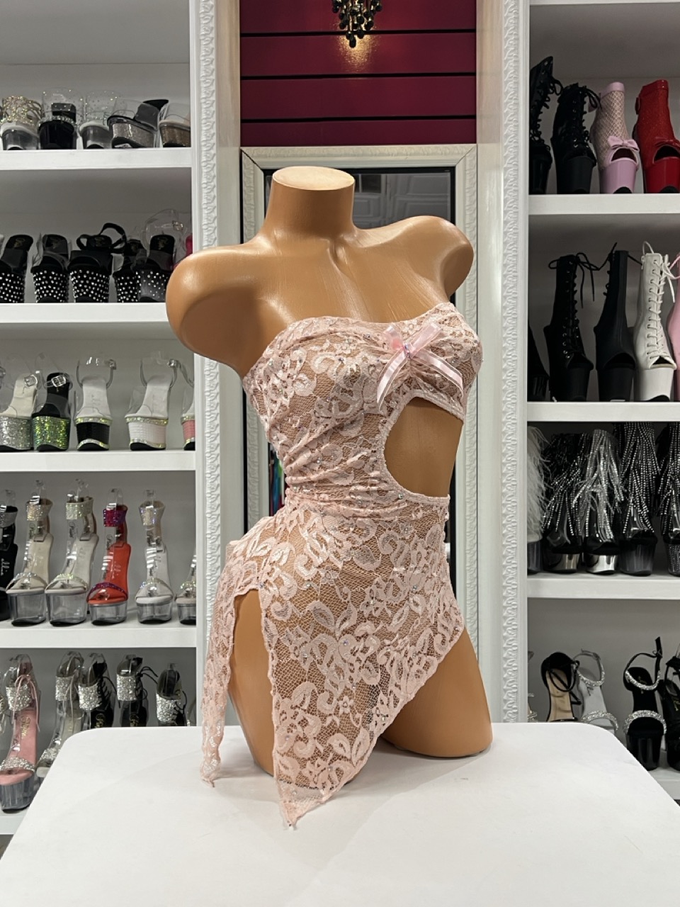 Blush Lace Cutout Dress with sheer pink lace fabric, rhinestone accents, and asymmetrical side slit mini dress design