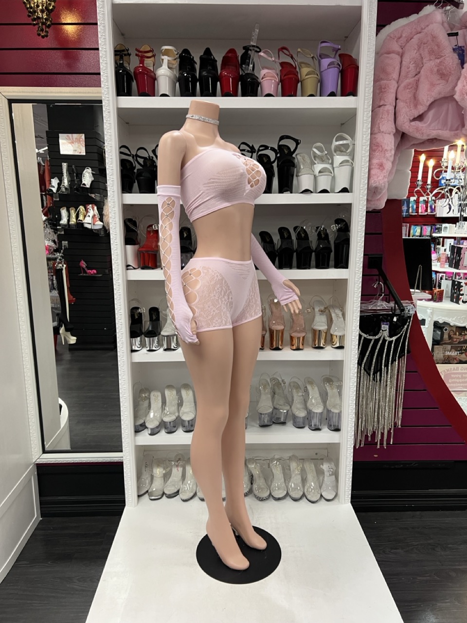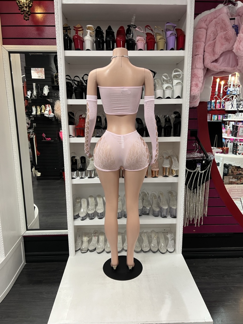 urn heads in this dreamy blush 3-piece set featuring a mesh bandeau top with flirty crisscross cutouts, matching high-waisted lace shorts, and sheer fingerless arm sleeves. This ultra-feminine look combines soft stretch with seductive details, perfect for a performance, a night in, or a confident stroll through your own spotlight.