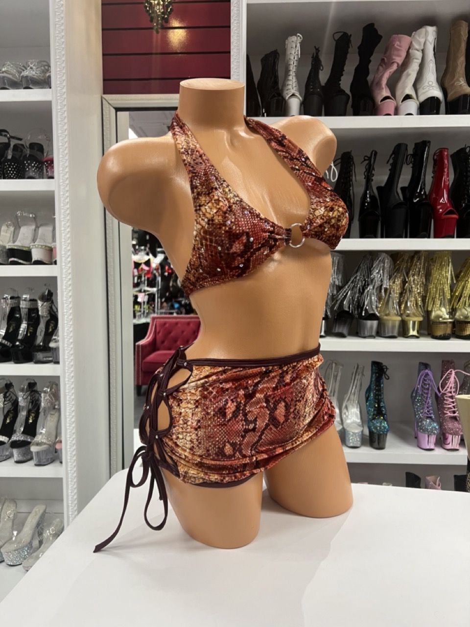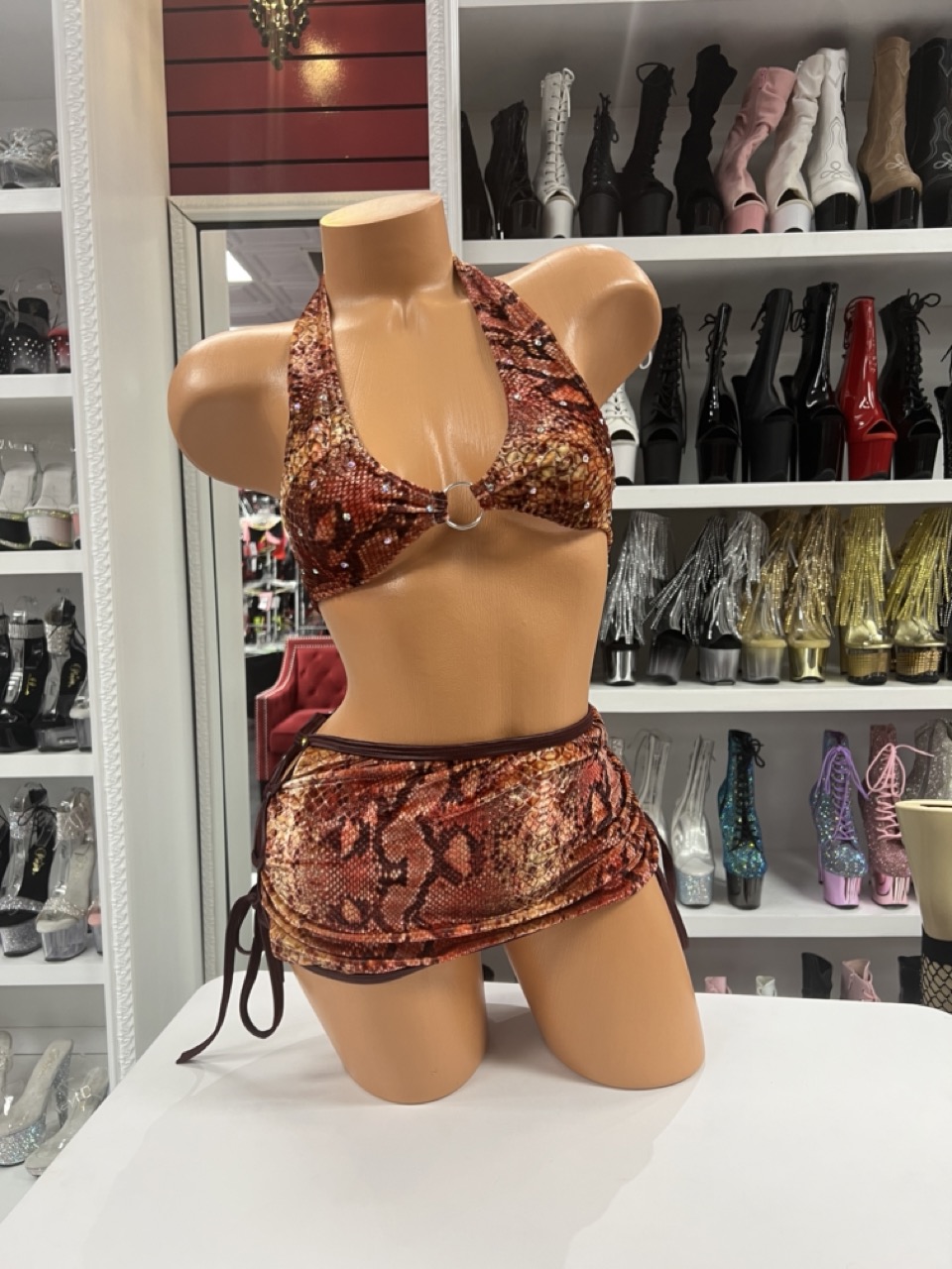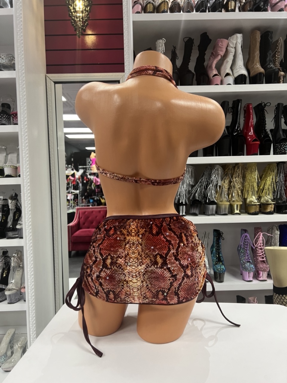 Bronze Python Mini Set in metallic snakeskin print with halter top and adjustable ruched mini skirt.