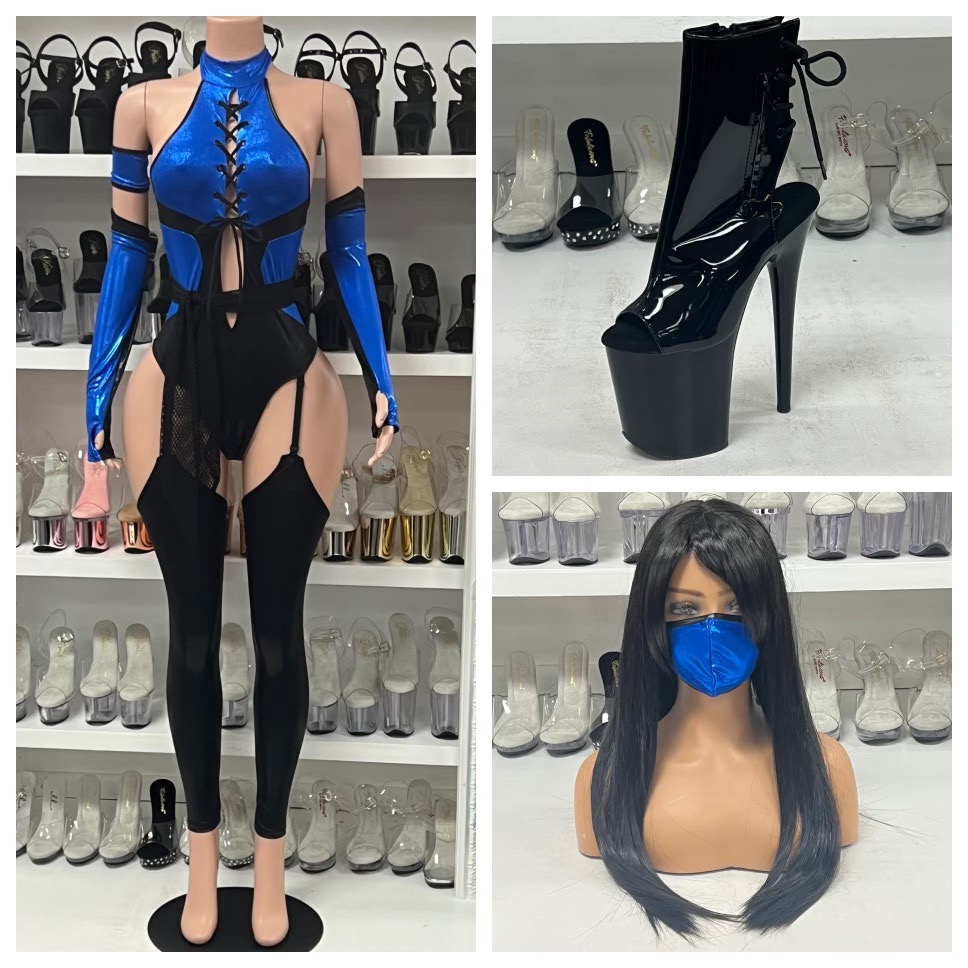 6-piece sexy video game character costume features mockneck metallic lace-up cutout bodysuit with garters and matching leg accessories and fingerless gloves and net sash with skeleton pin and matching armband and mask. No returns or exchanges.