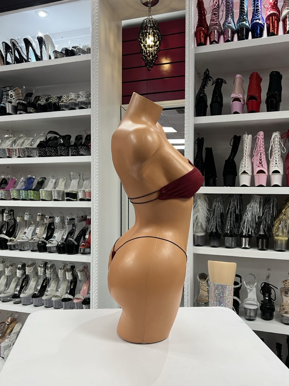 Burgundy bandeau bikini set with minimalist micro bottom for stage wear