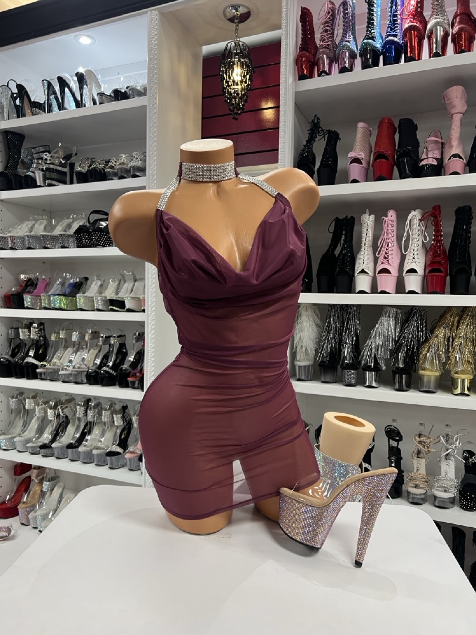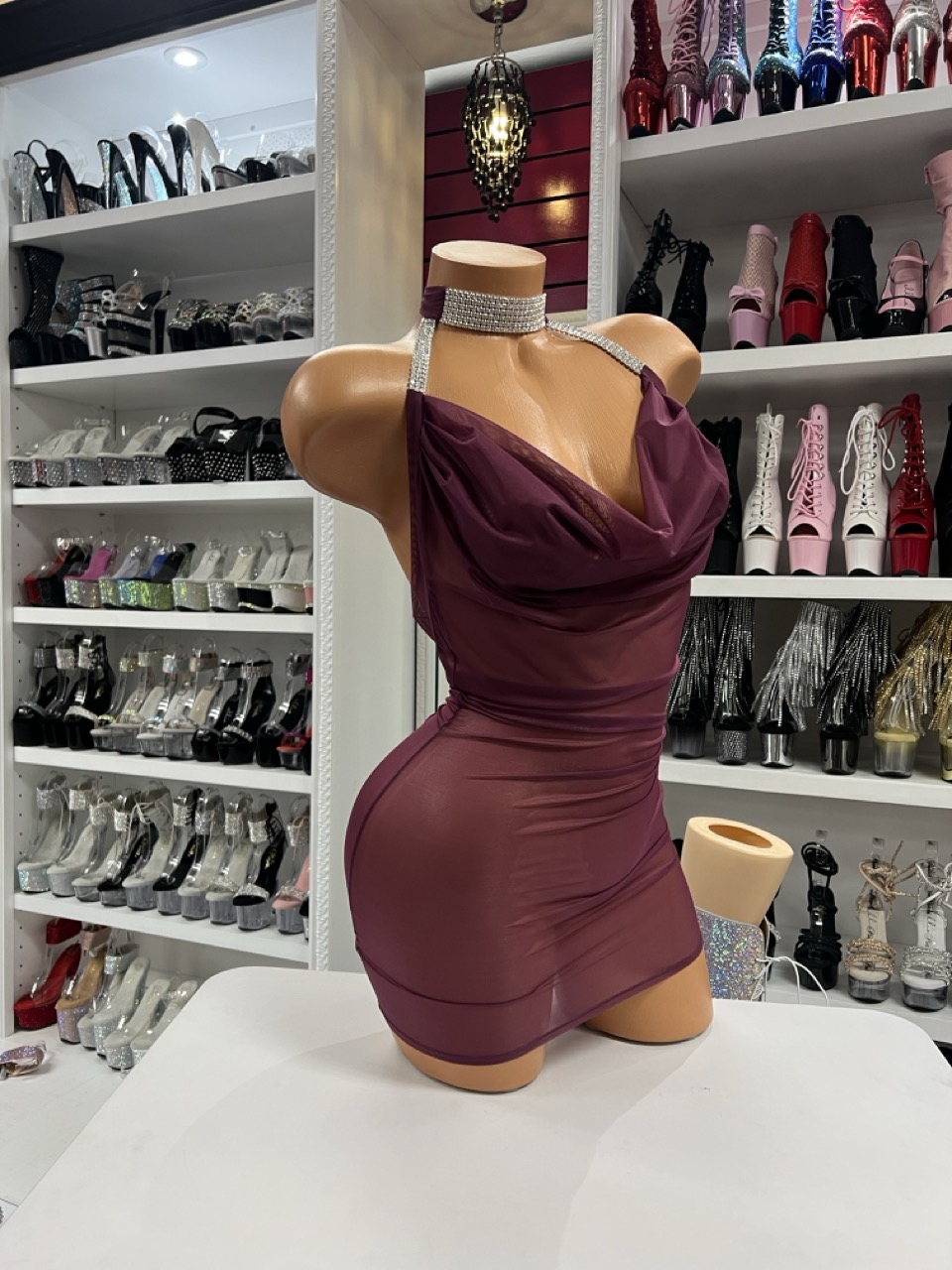 Burgundy sheer mini dress with rhinestone choker neckline displayed on mannequin