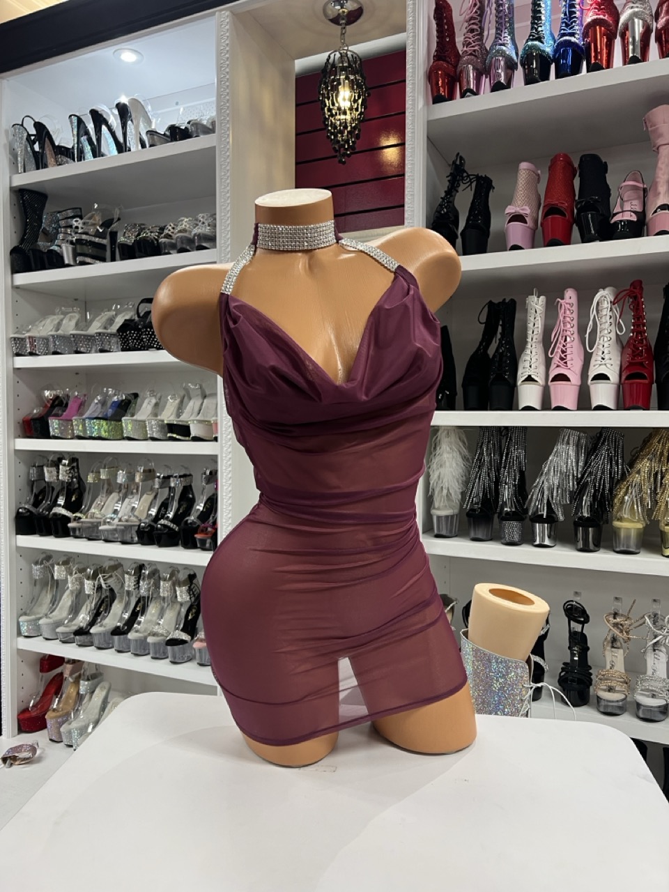 A sheer burgundy mini dress featuring a draped neckline and rhinestone choker for high-impact stage appeal. Designed with stretch mesh for comfort, flexibility, and confident movement.