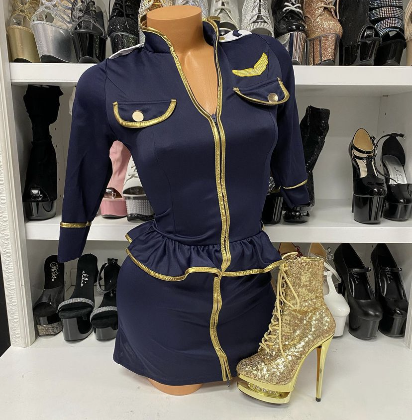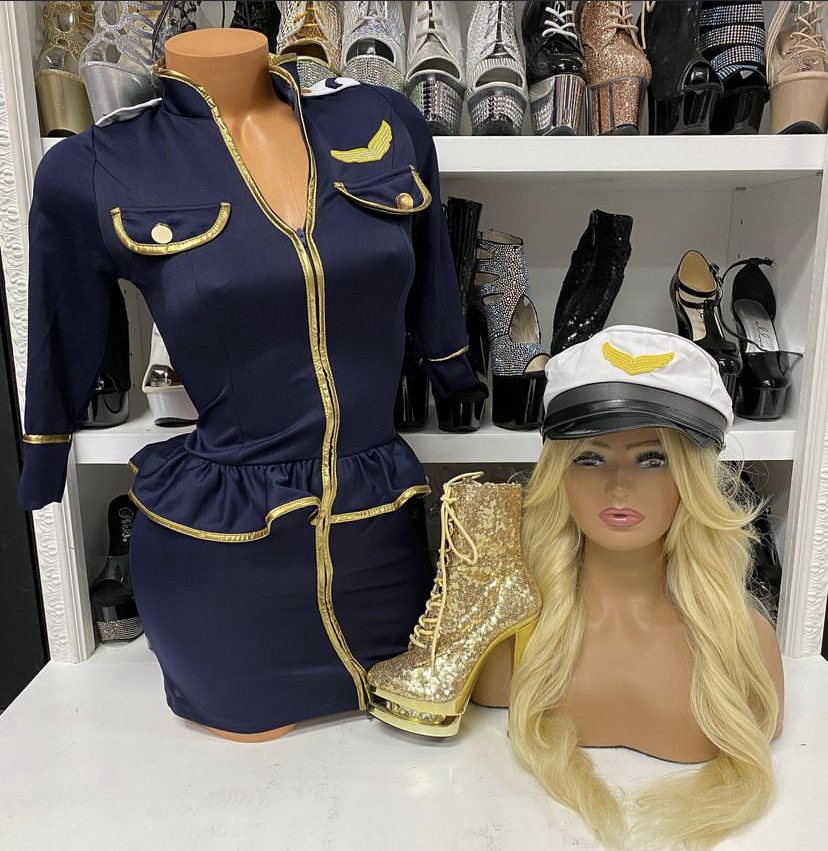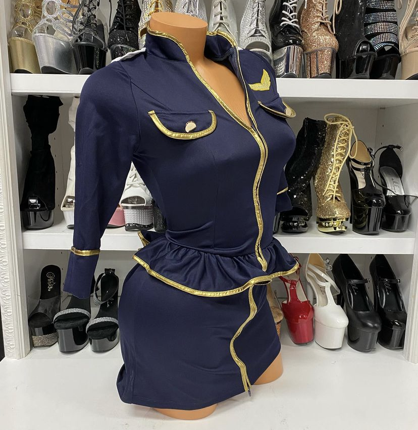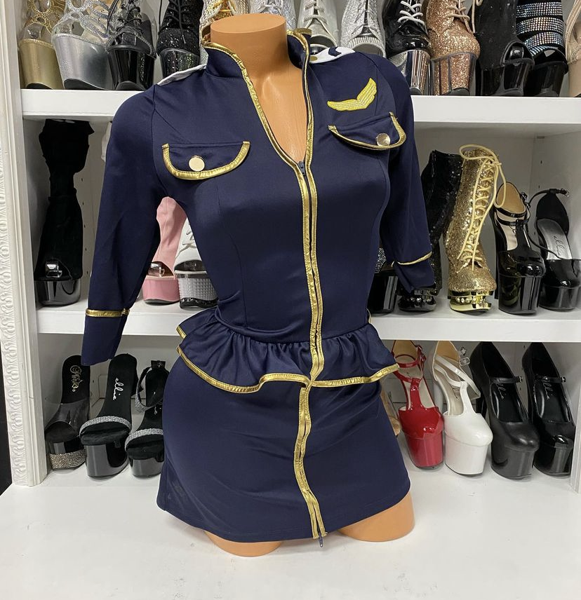 includes Sexy mini dress with front zipper and Cute pilot headdress. No returns or exchanges.
