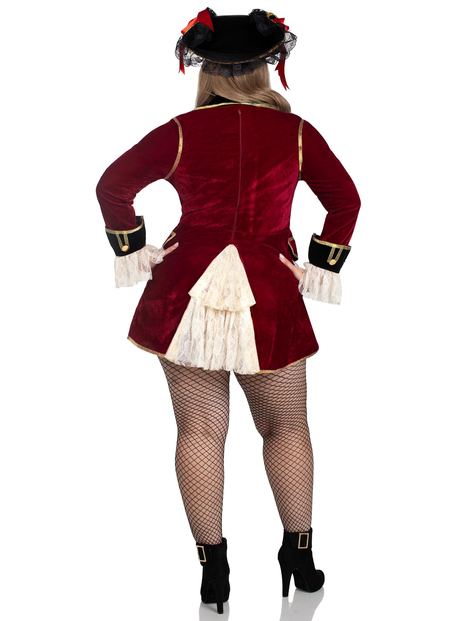Captivating Pirate Captain, features a velvet coat dress with tie-front peasant bodice and lace ruffle accents. No returns or exchanges.