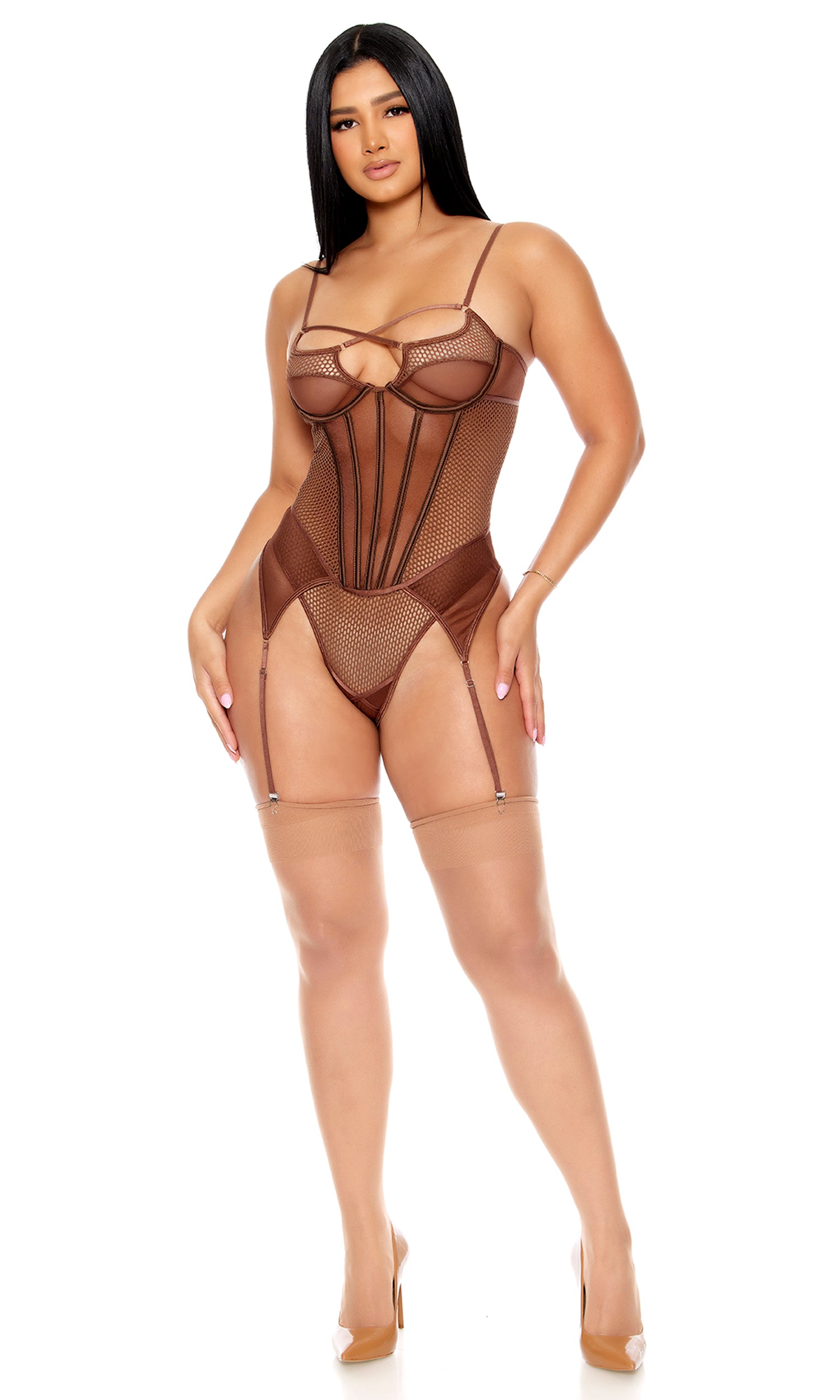 O-net O-ring cutout teddy with garters. No returns or exchanges.