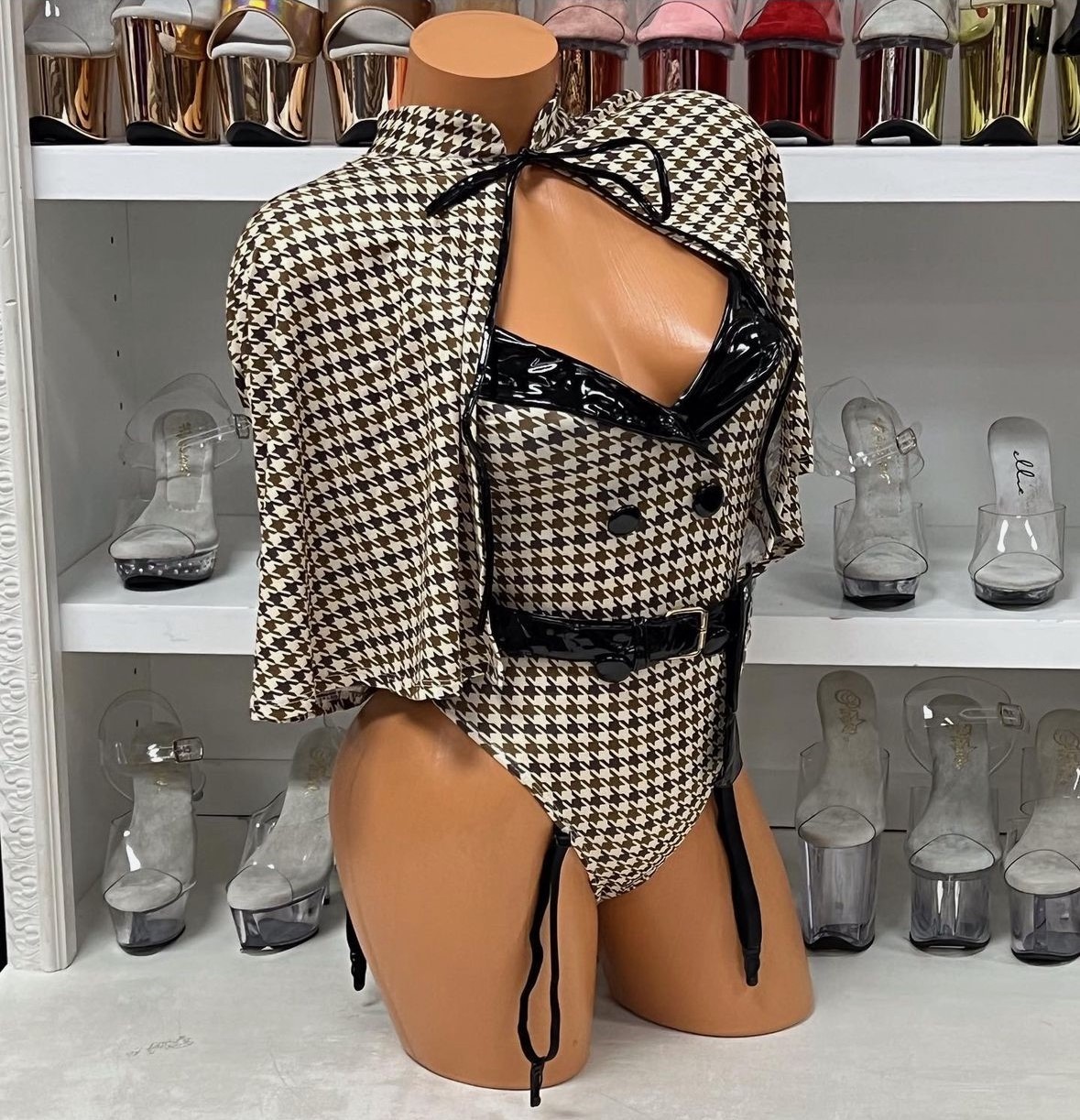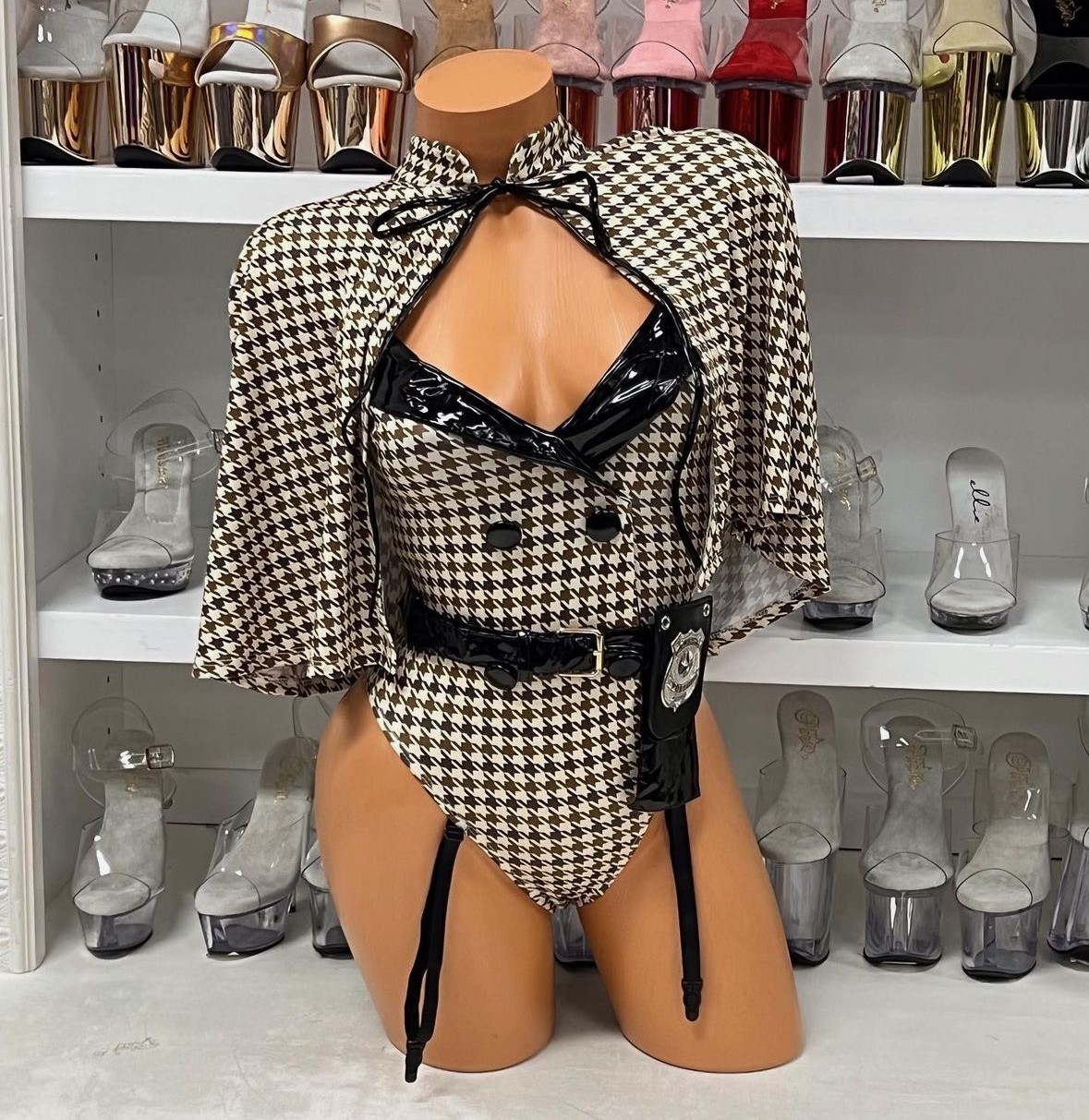 8pc. sexy detective costume features houndstooth bodysuit with contrast vinyl labels and garters paired with matching cape and belt and fingerless gloves and magnifying glass. No returns or exchanges.