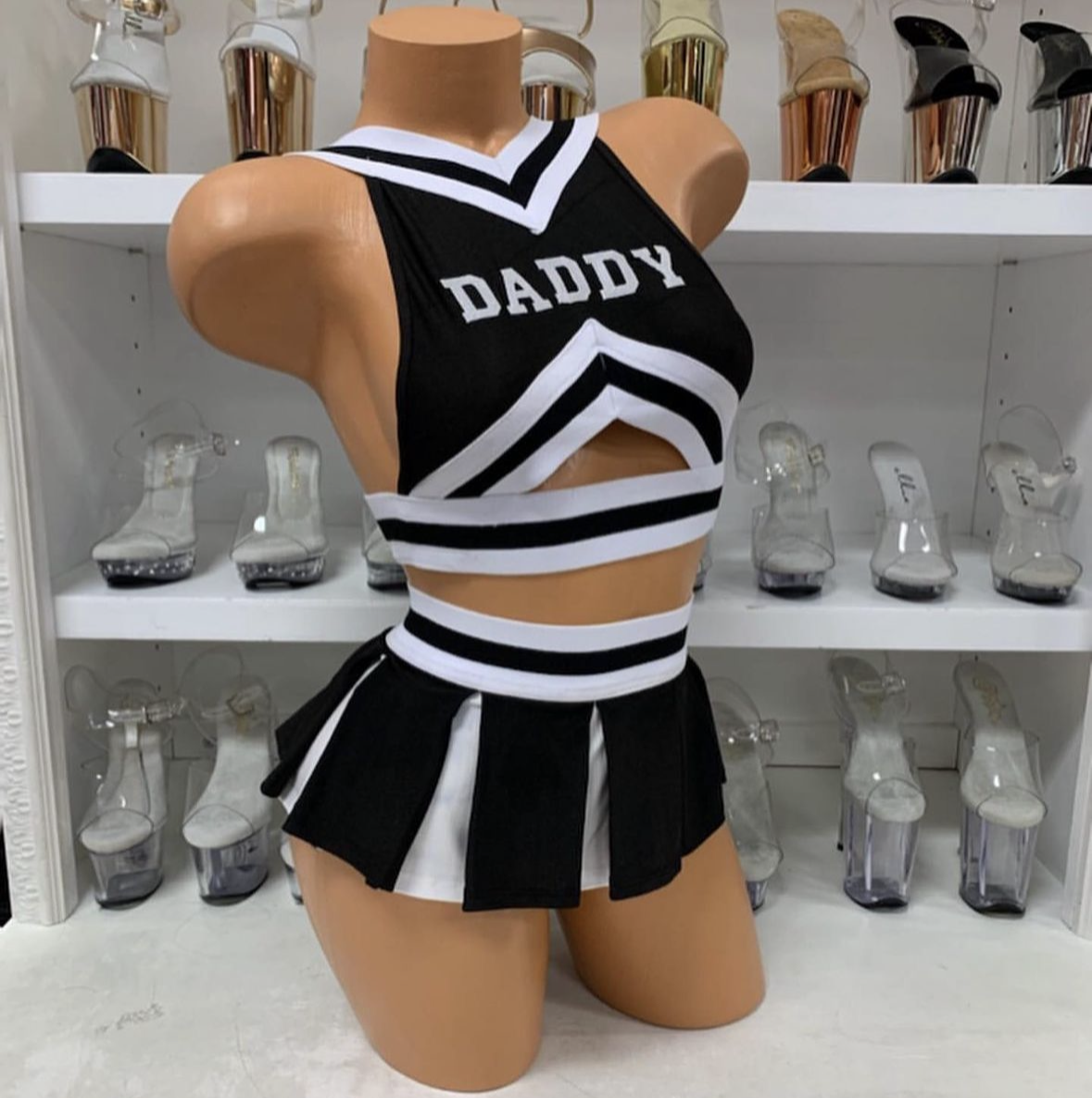 2pc. sexy cheerleader costume features halterneck peekaboo cutout crop top with elastic stripe design detail and DADDY screen print paired with matching pleated mini skirt. No returns or exchanges.