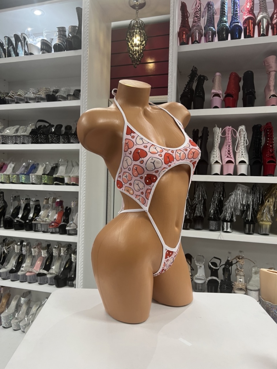 Cherry print halter bodysuit with dramatic cutout design. Playful pattern meets bold stage silhouette.