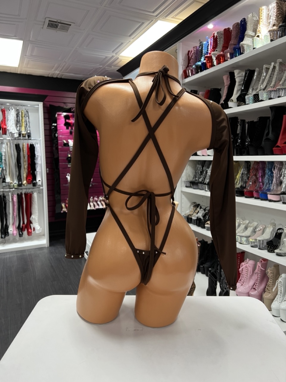 Chocolate rhinestone strap set with crisscross harness detailing and long sleeves