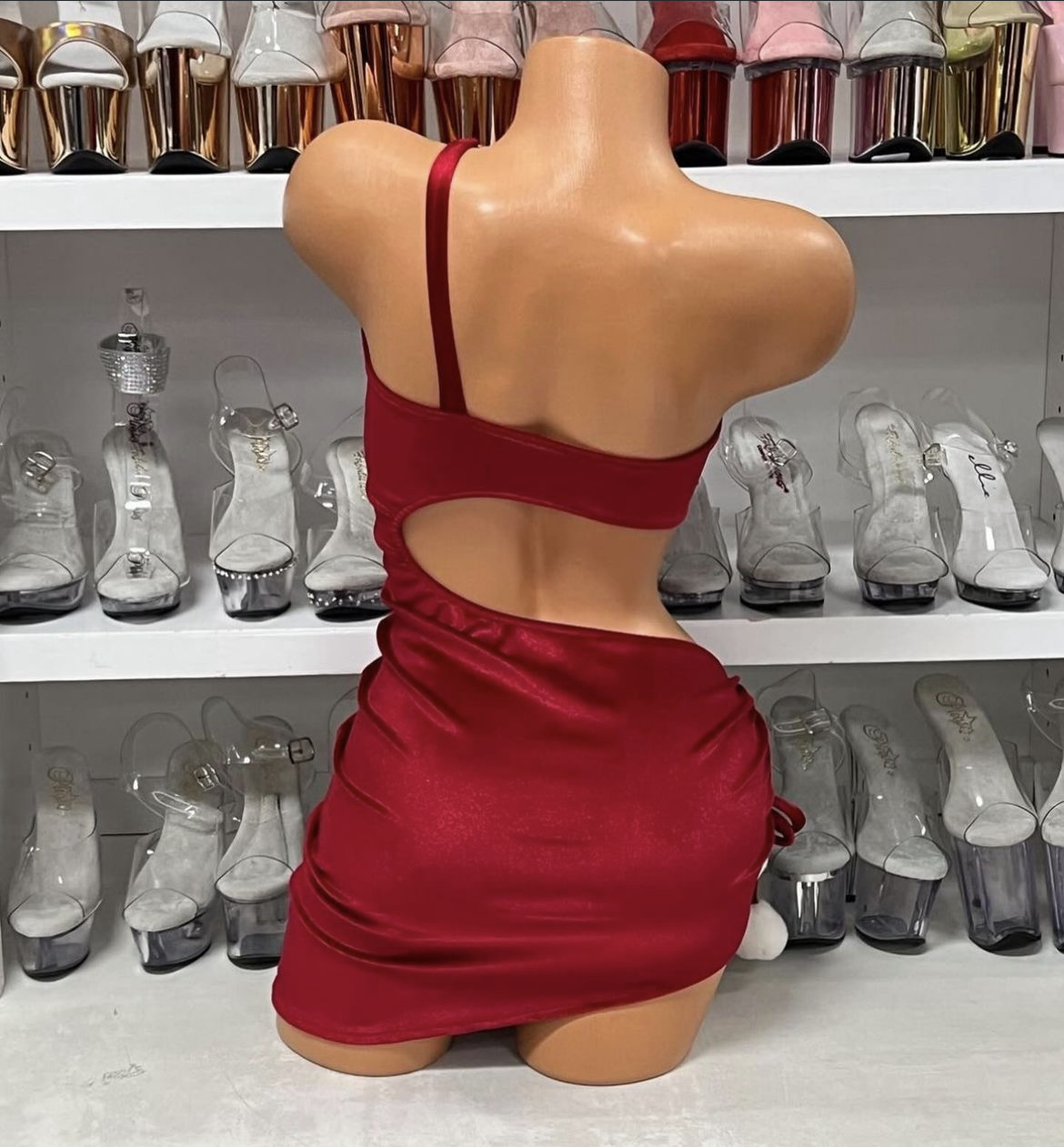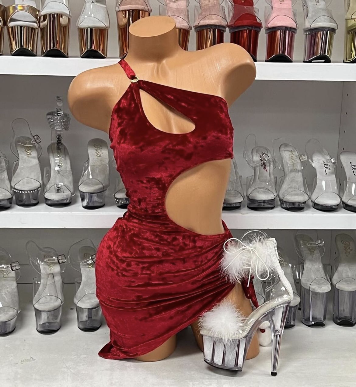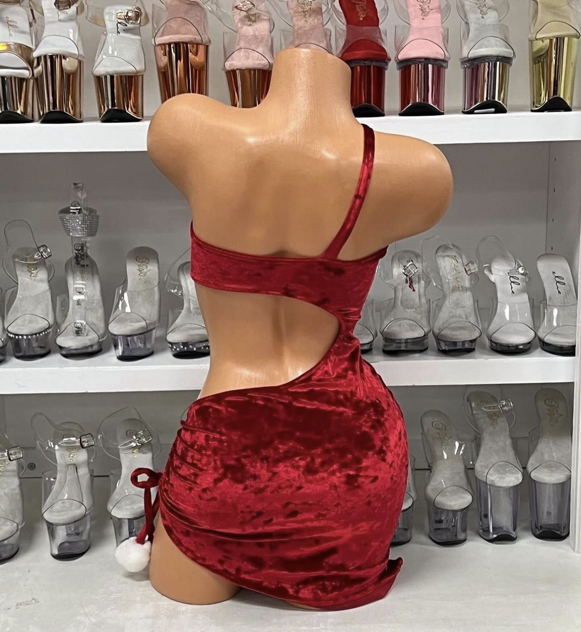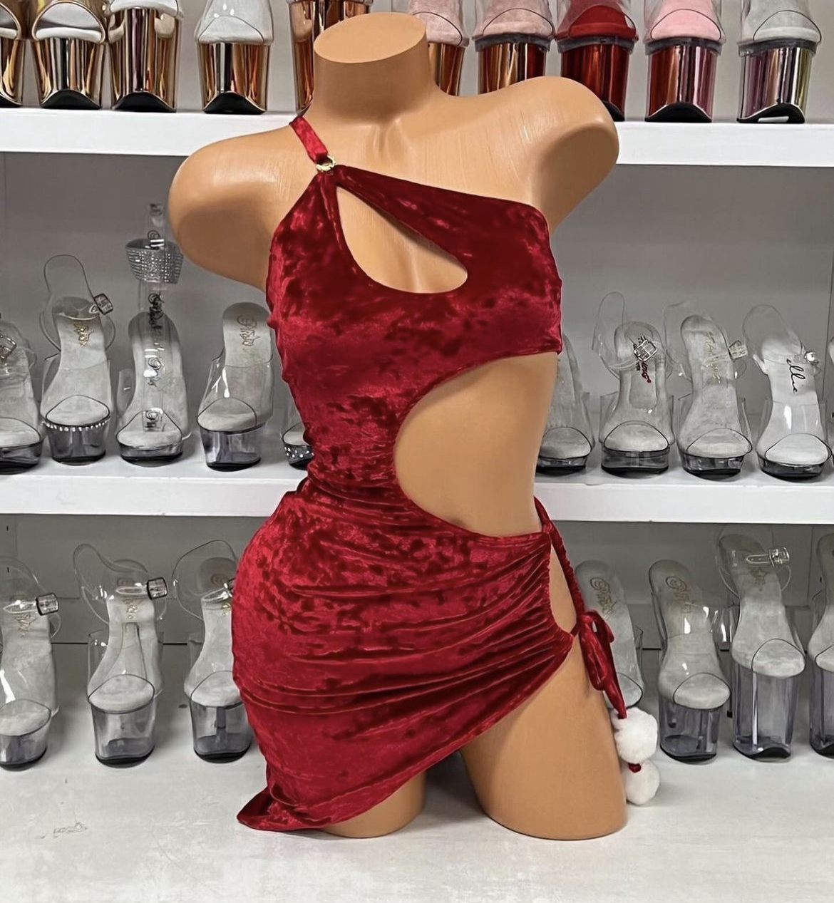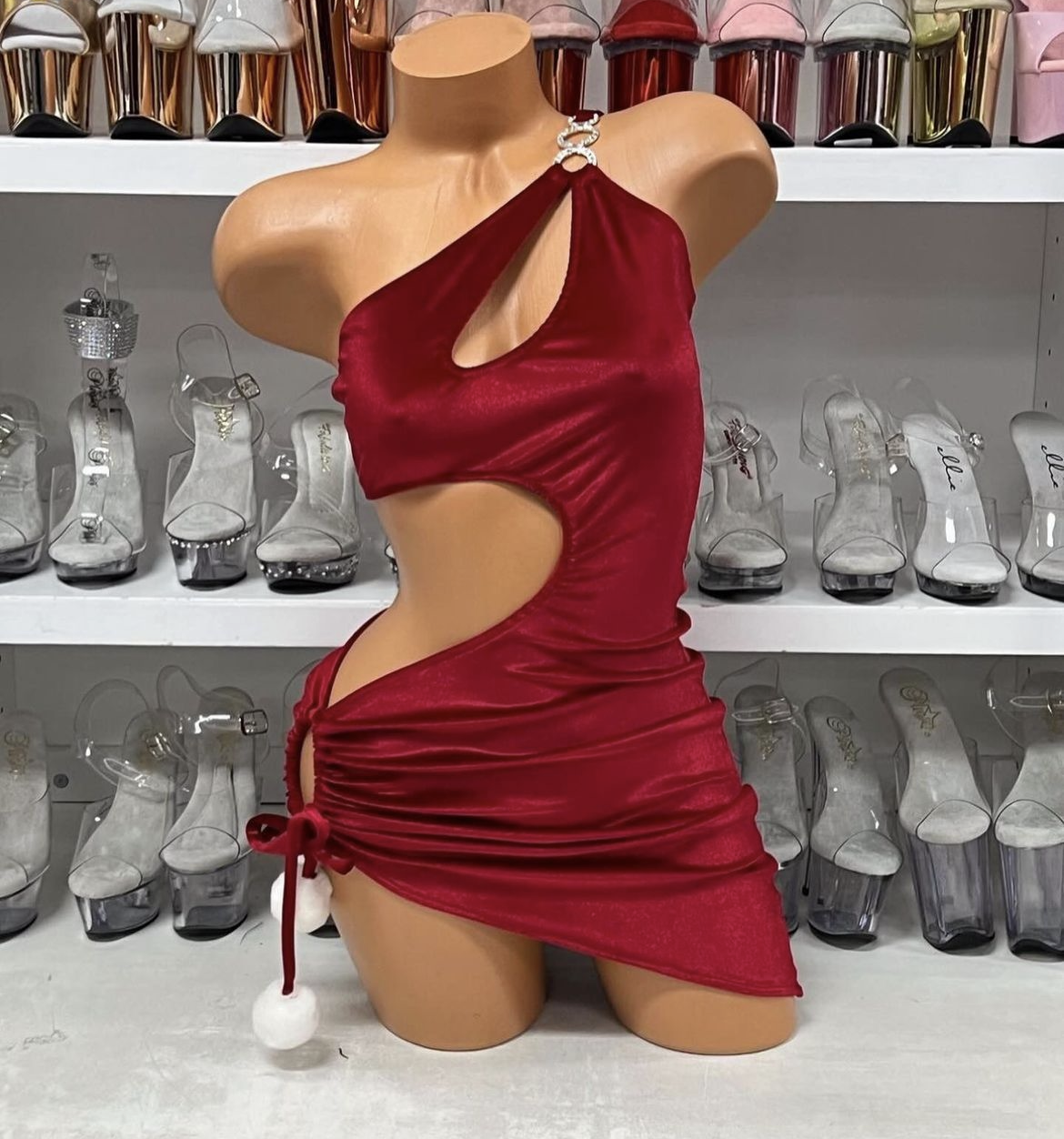 The Red Christmas Cutout Dress is a bold mini with a side cutout, rhinestone strap, and pom-pom details. Perfect for holiday parties or stagewear.