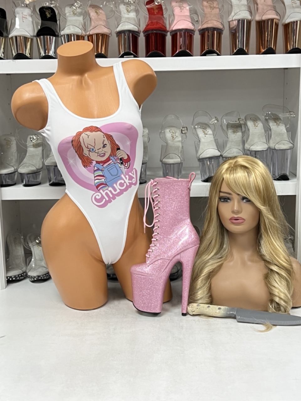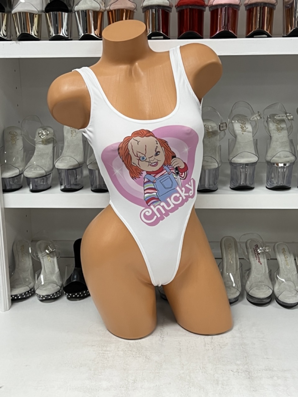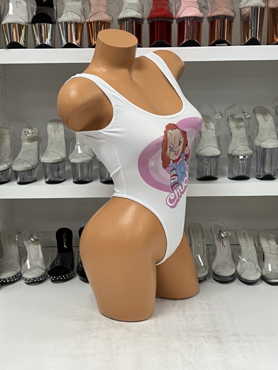 Slay in style with the Chucky White Bodysuit — features a pink heart graphic and iconic horror twist for the ultimate mix of cute and killer.