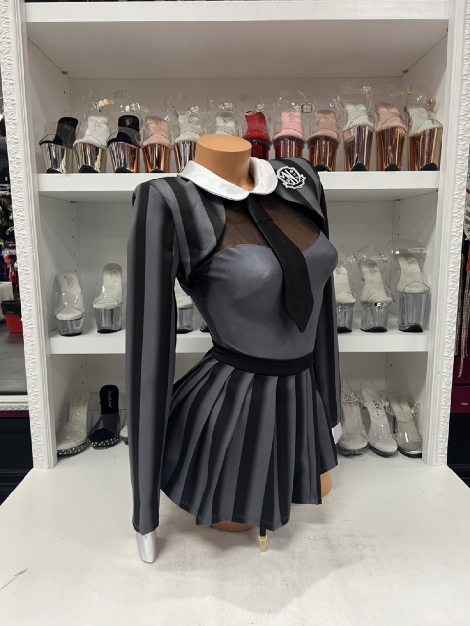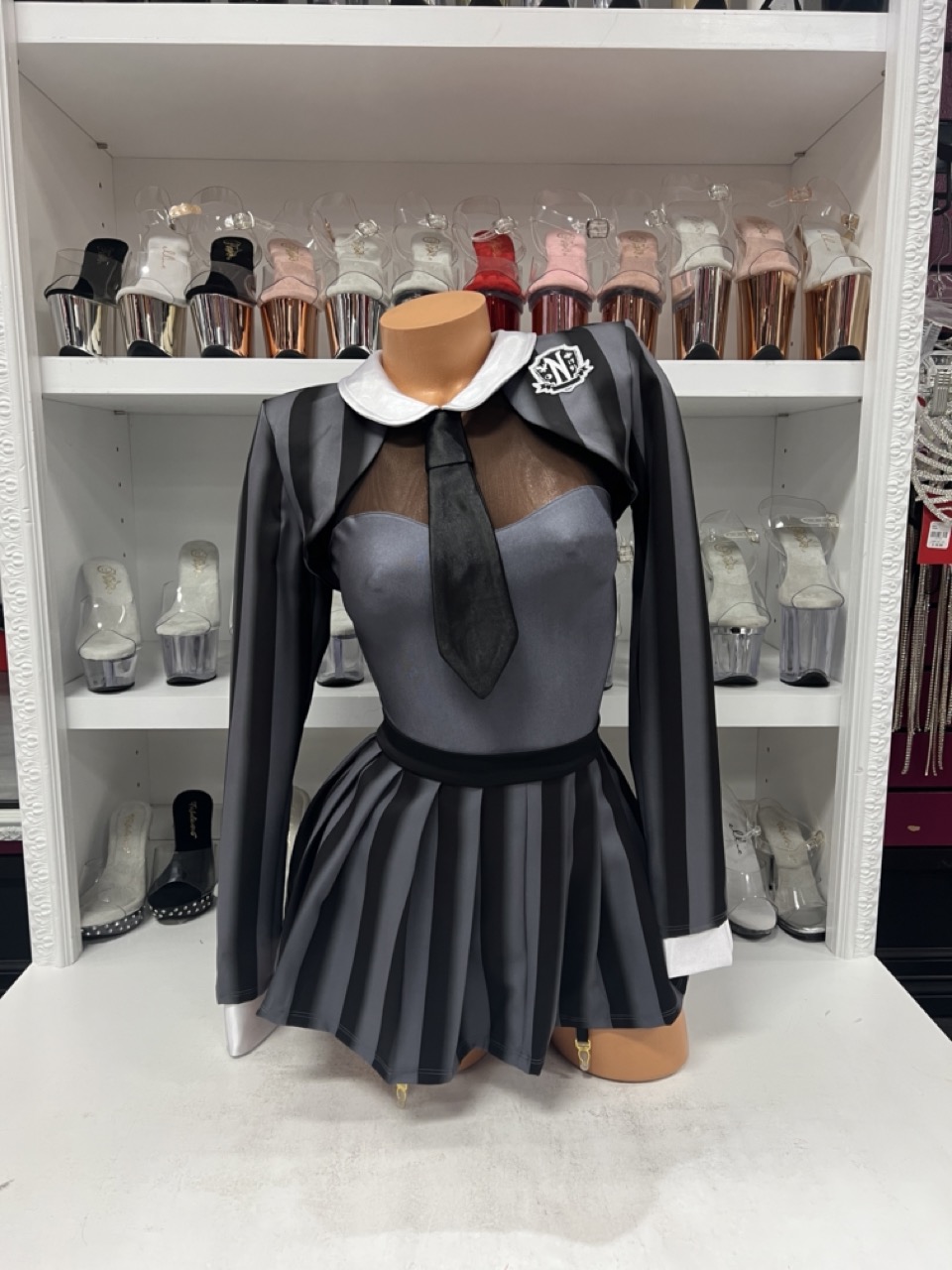 Class On Wednesday Costume includes pleated skirt, bodysuit with garters, and cropped jacket. A dark twist on classic schoolgirl style.