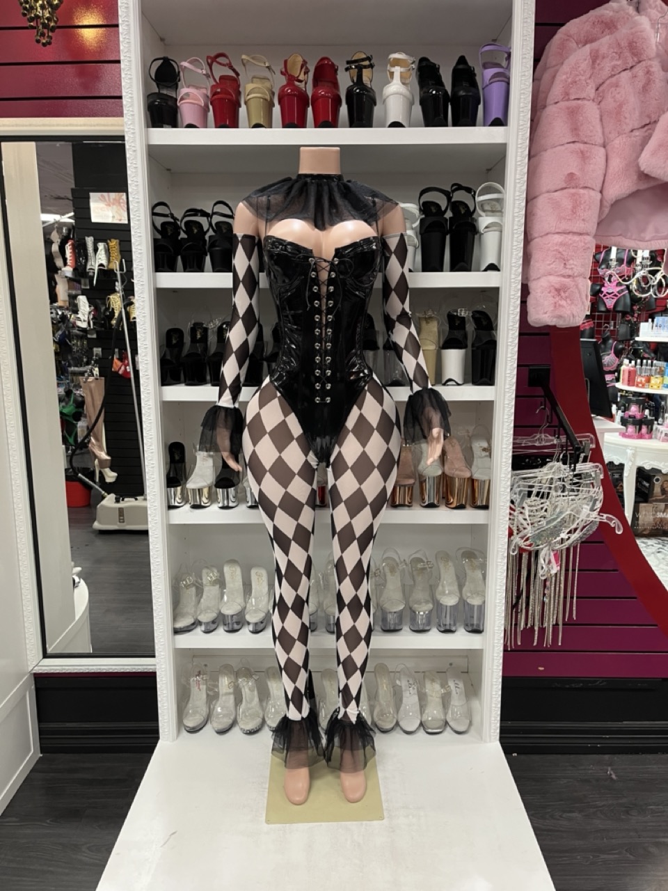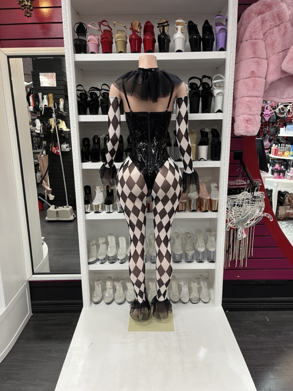 Clowning Around Costume with harlequin print leggings, corset bodysuit, collar, and accessories. Bold carnival style perfect for Halloween or cosplay.