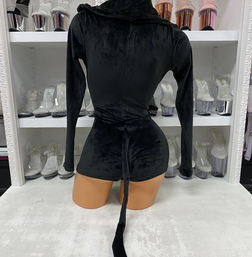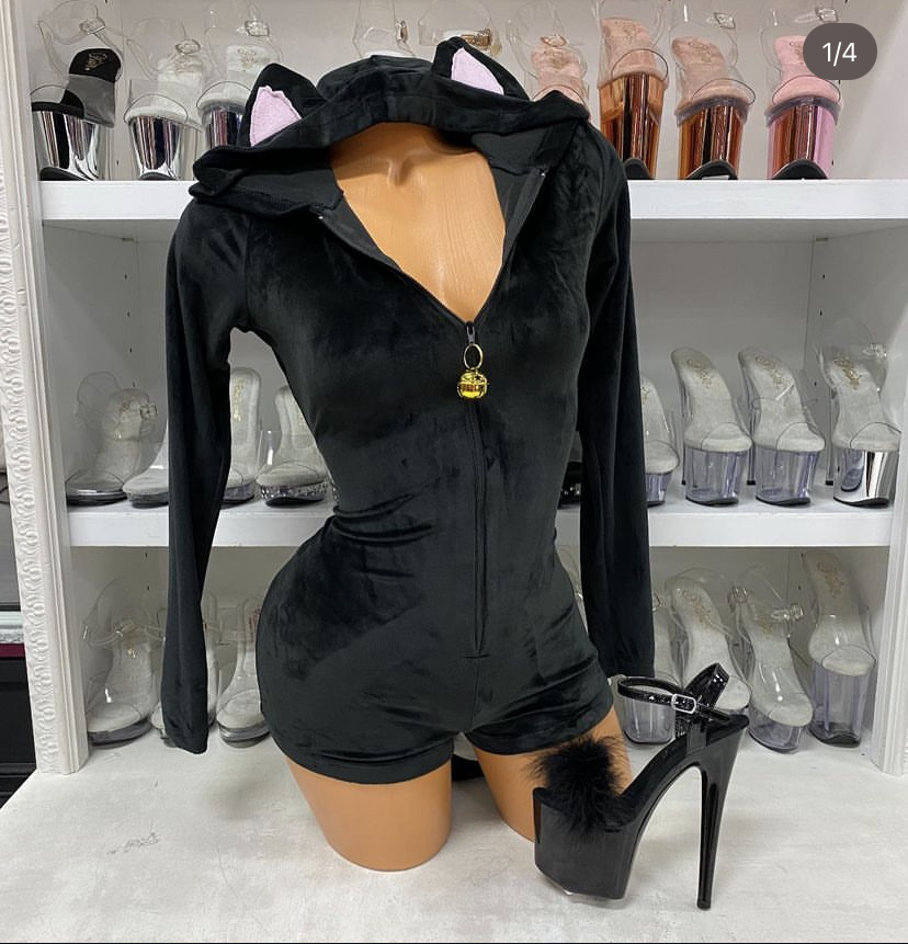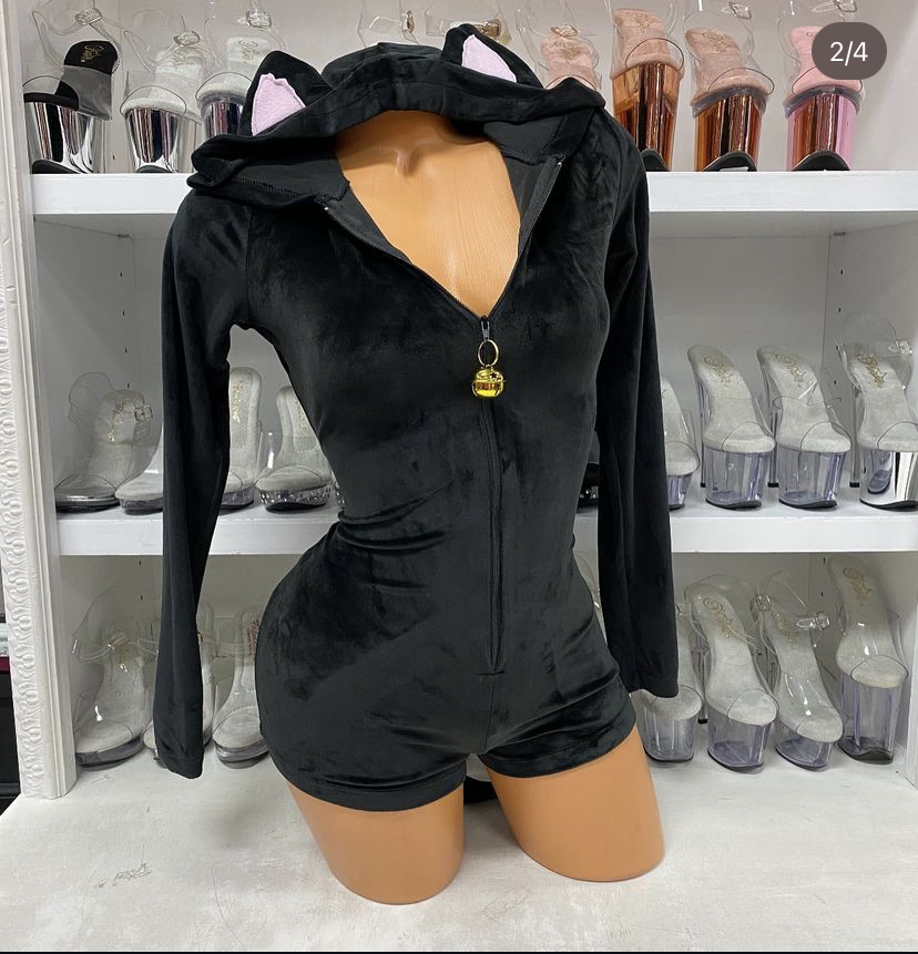 Comfy Cat, features ultra-soft velvet plush zip up romper with bell zipper pull, ear hood, and kitty tail. No returns or exchanges.
