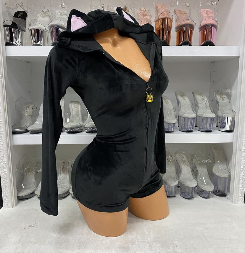 Front view of a glossy mannequin wearing a black plush velvet Comfy Cat romper with zip front, pink-lined cat ear hoodie, and bell charm, posed beside black fuzzy platform heels. Displayed in a boutique with clear platform heels arranged on white shelves in the background.