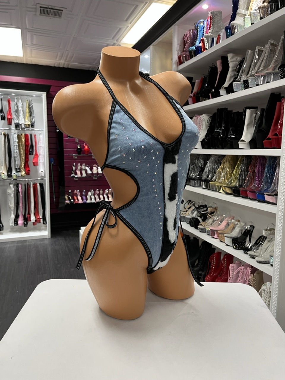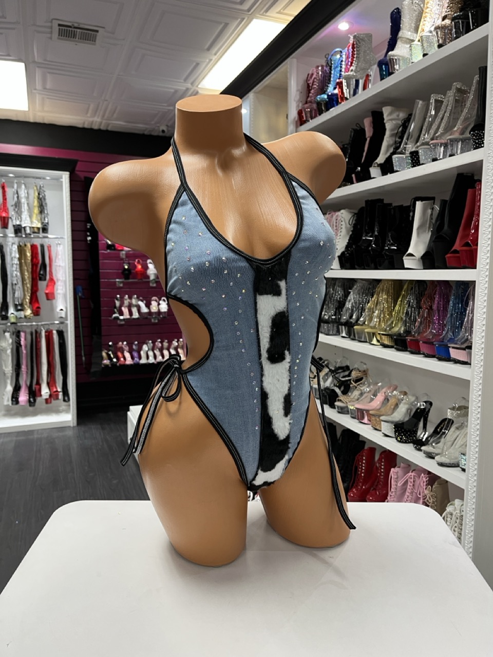 Cow print denim bodysuit with halter ties, rhinestones, and bold Western styling. Perfect for rodeo nights and country concerts.