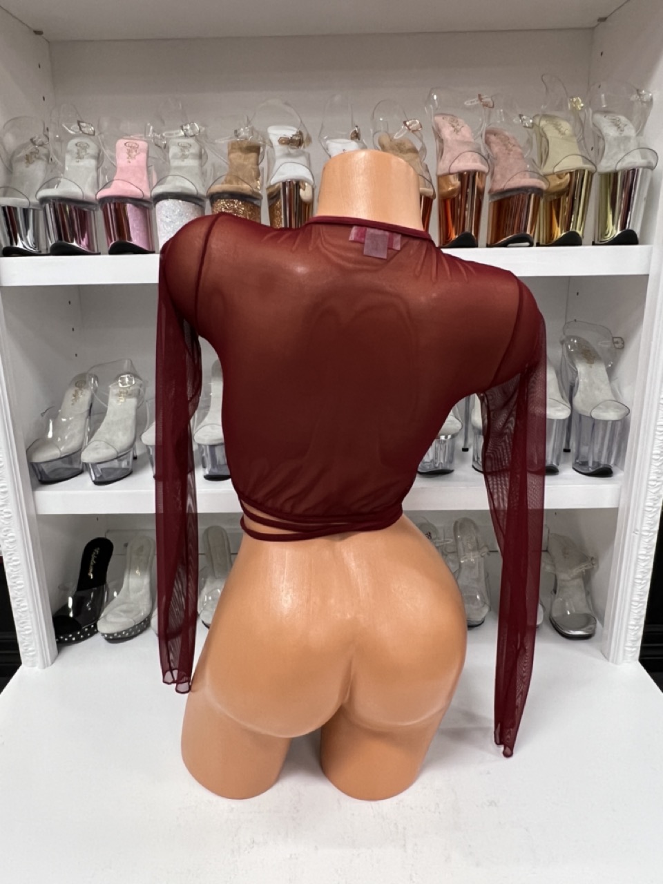 This captivating burgundy mesh top features a wrap-around design with adjustable tie closure and long sleeves. The sheer mesh fabric creates an alluring silhouette while the customizable fit ensures comfort and confidence for any occasion. No returns/exchanges.