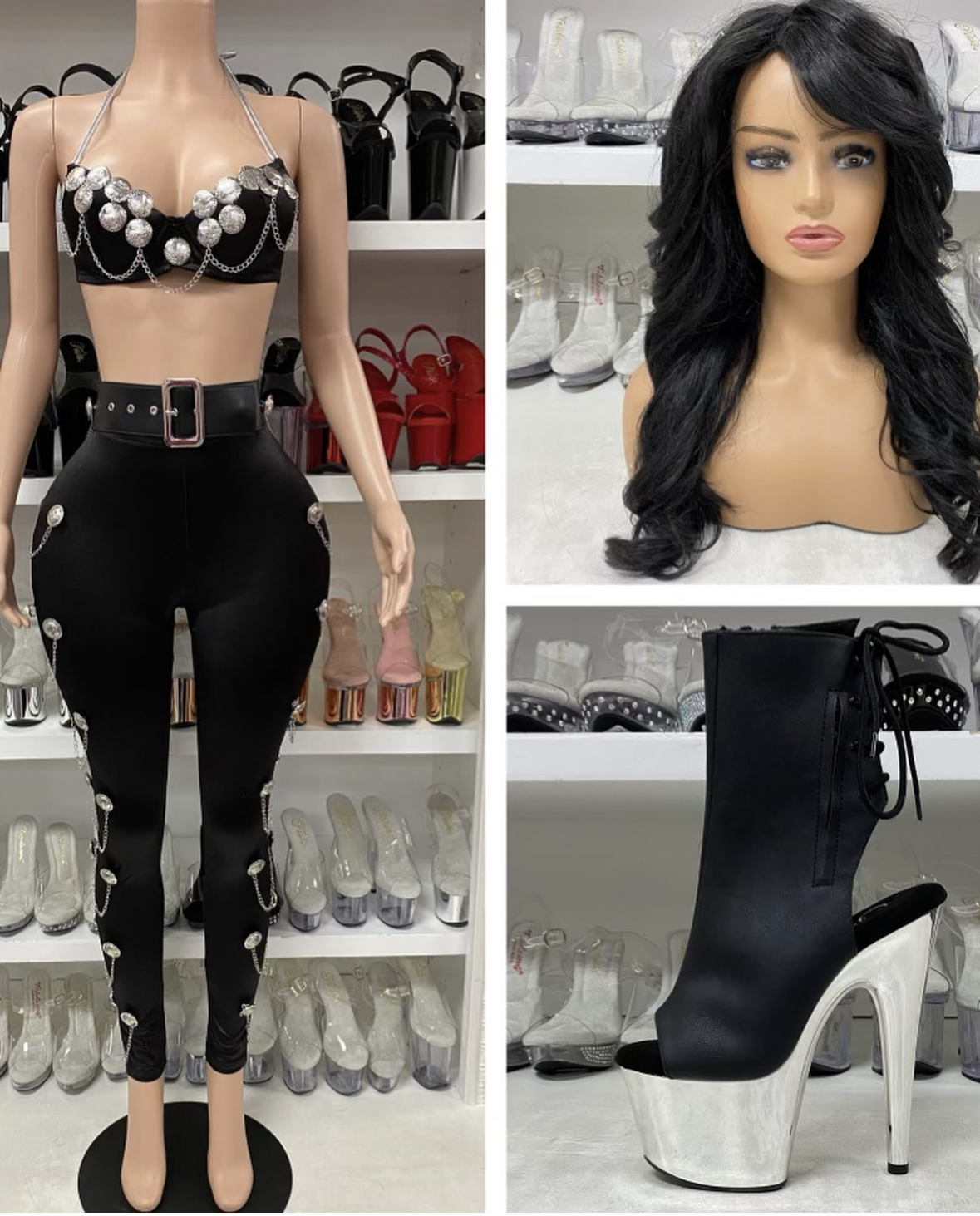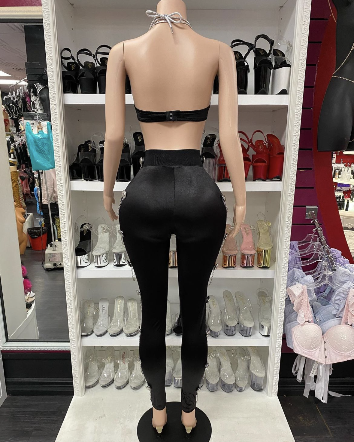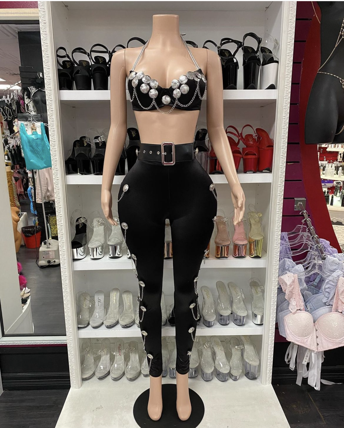 4-piece sexy celebrity costume features underwire cup halterneck tie bra with metal hardware ornamental and chain detail paired with matching leggings with hardware at sides and belt with buckle and hoop earrings. No returns or exchanges.