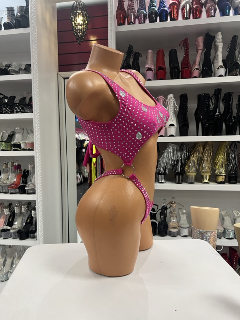 Dark Fuchsia Crystal Romper is a bold open belly one-piece covered in sparkling rhinestones and teardrop crystal accents. Designed with a high-cut leg and metal side ring detail, it enhances curves while delivering maximum shine for stage, nightlife, and glam events.
