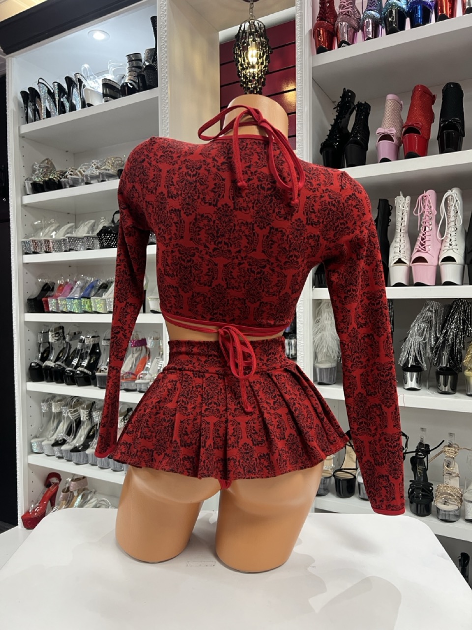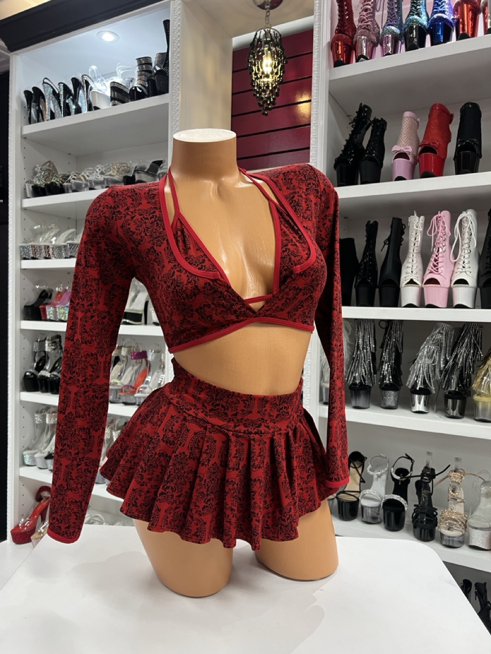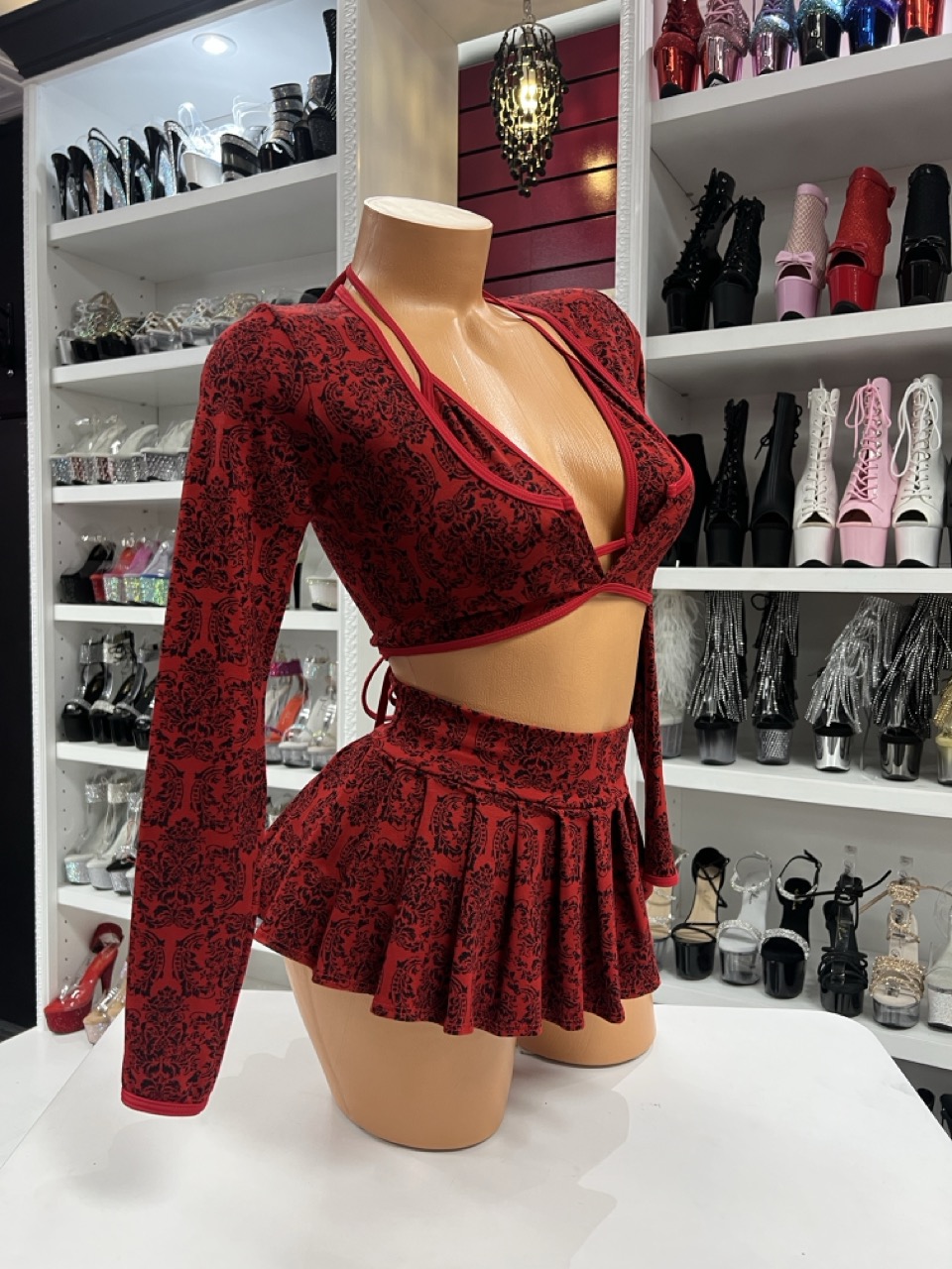 Four-piece red and black damask outfit with a triangle halter top and long sleeves, matching thong, and flared mini skirt for bold statement styling.