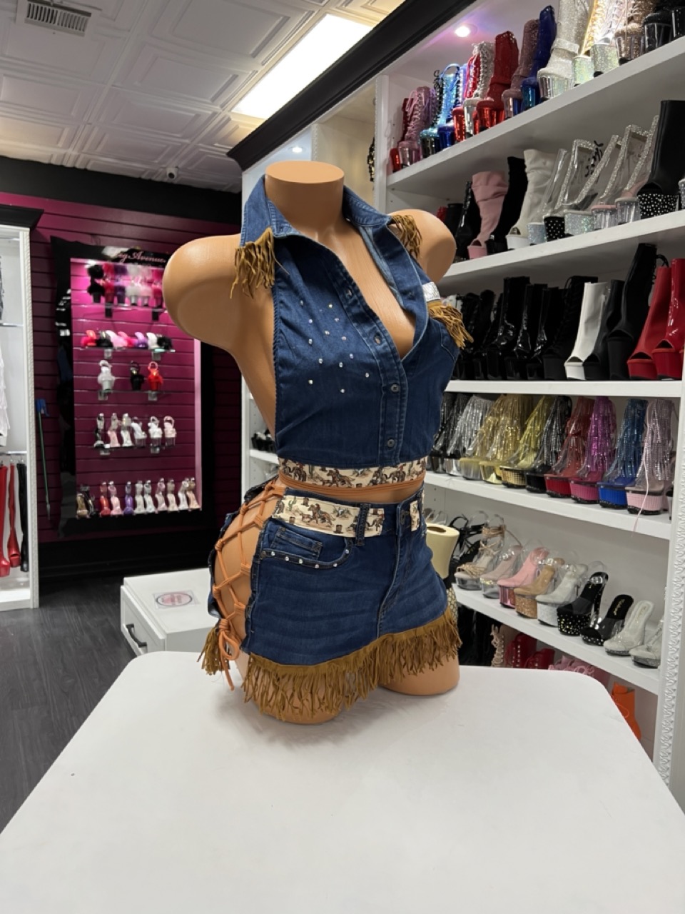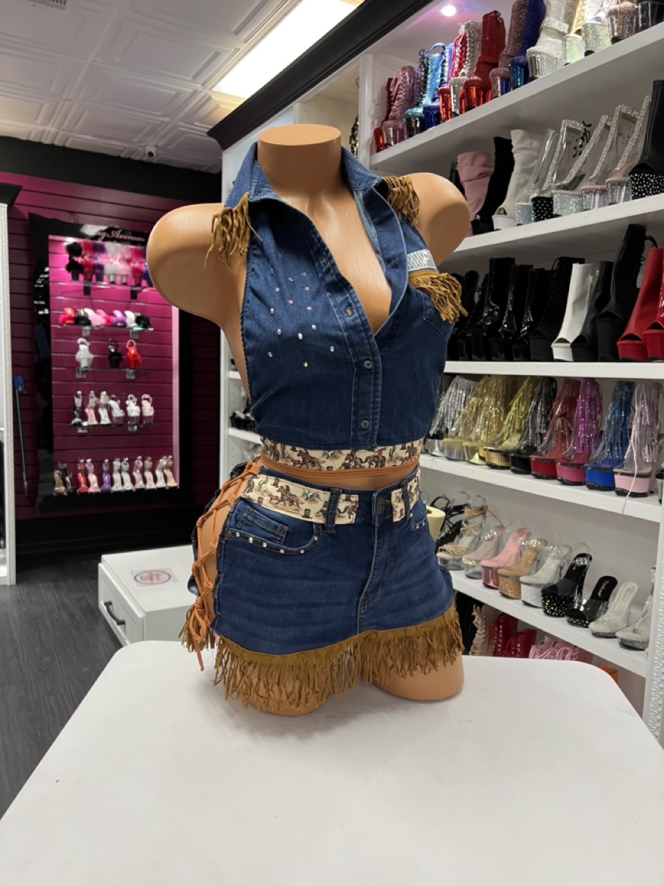 Western denim two-piece set with fringe details and subtle rhinestones. Perfect for rodeo events, stage performances, and bold cowgirl looks.