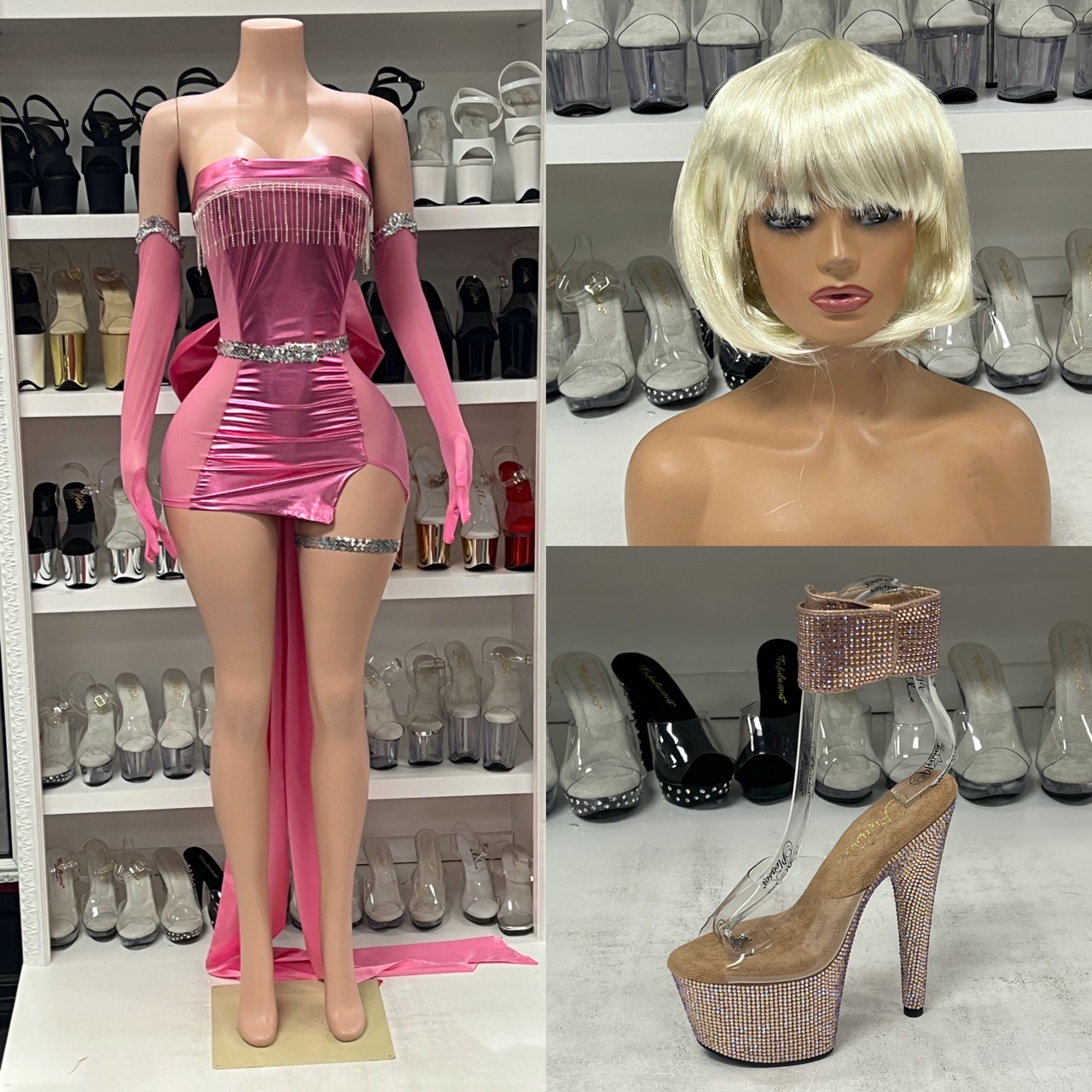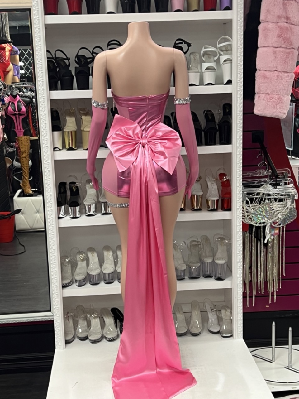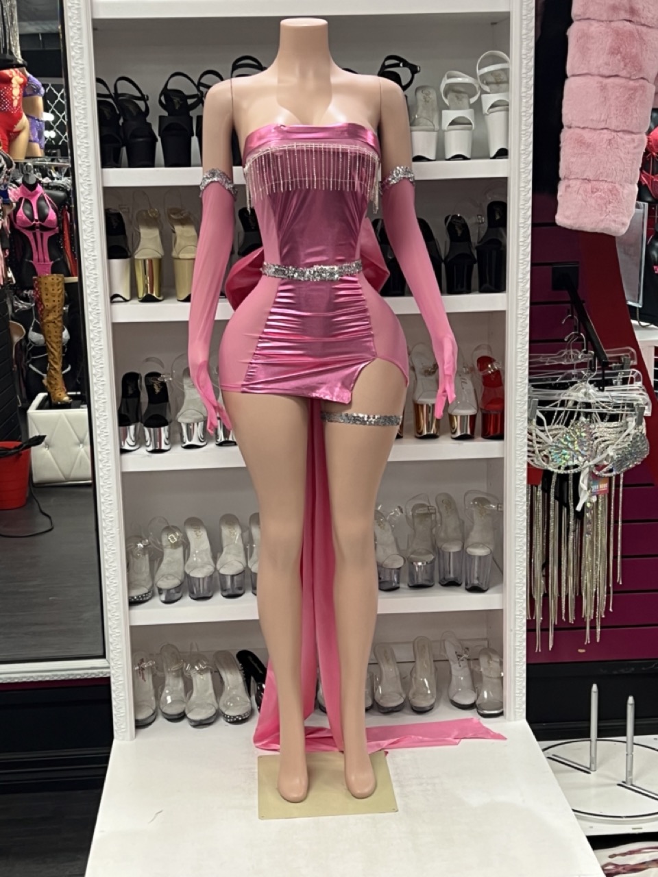 Diamond Honey Pink Costume includes dress, belt, choker, garter, and gloves. Bold, stylish, and designed for nightlife and performance.