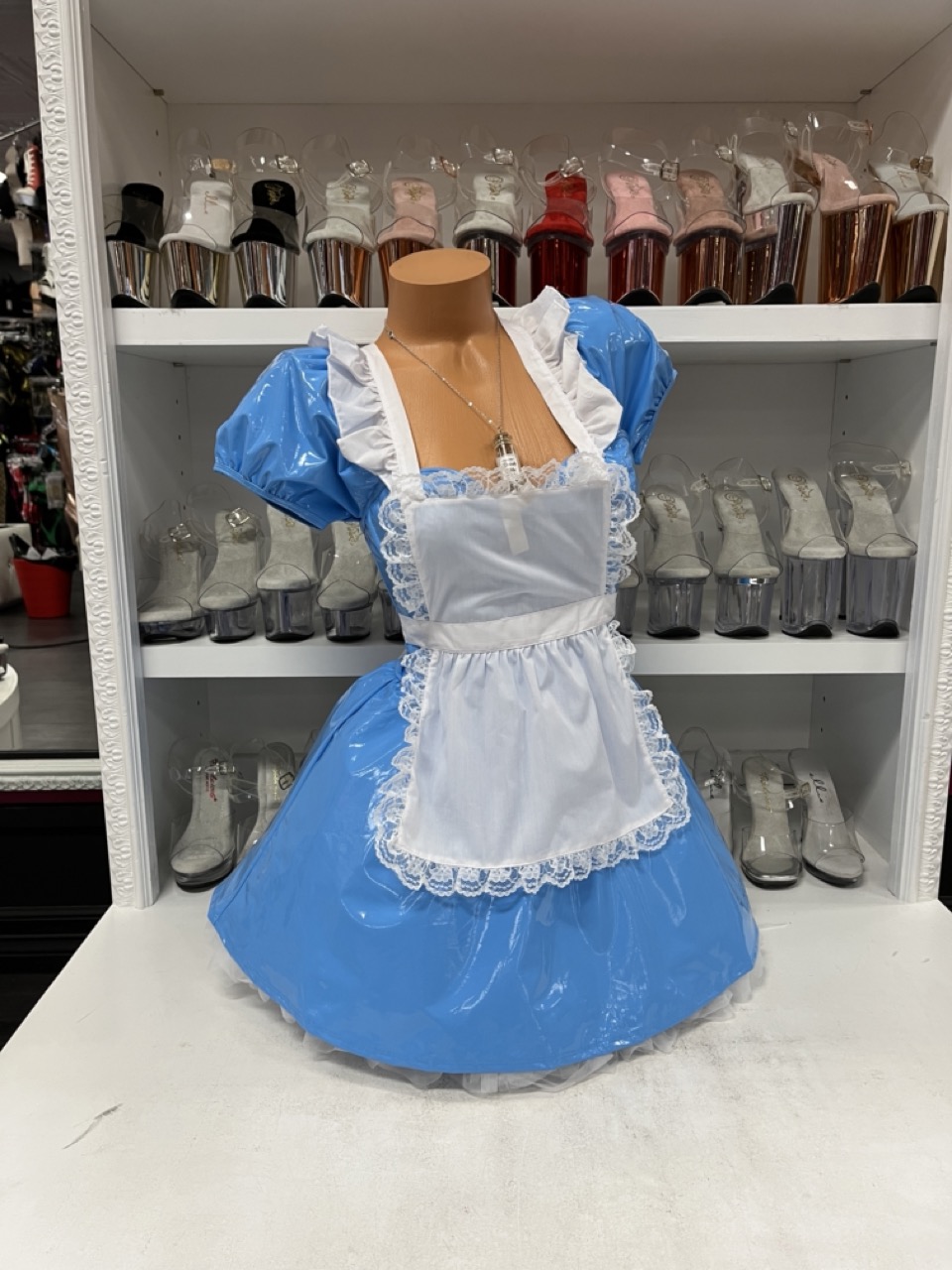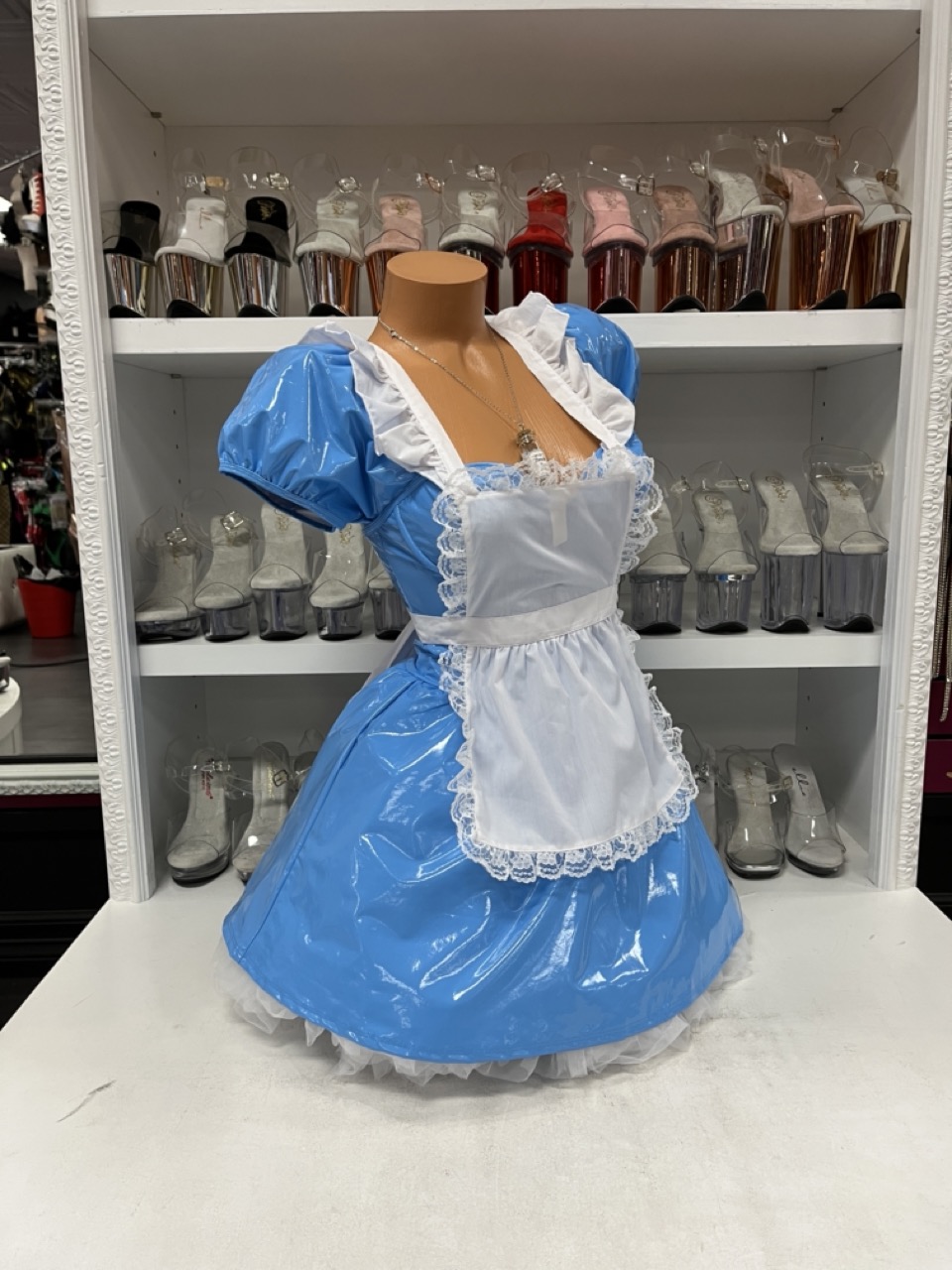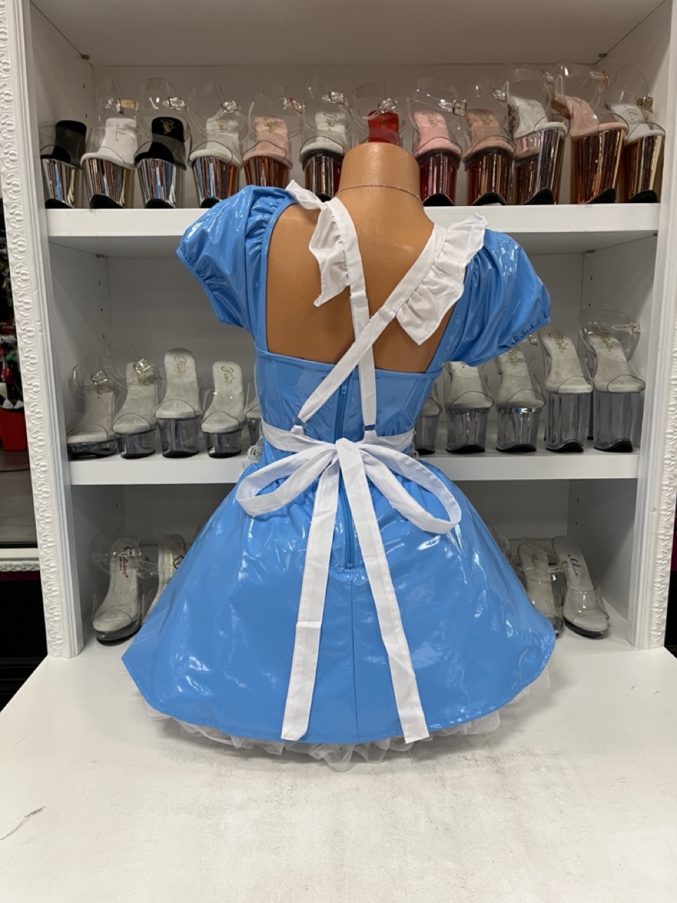 Down The Rabbit Hole Costume with puff-sleeve dress, apron, socks, bow headband, and necklace. A whimsical Alice-inspired look for parties and cosplay.
