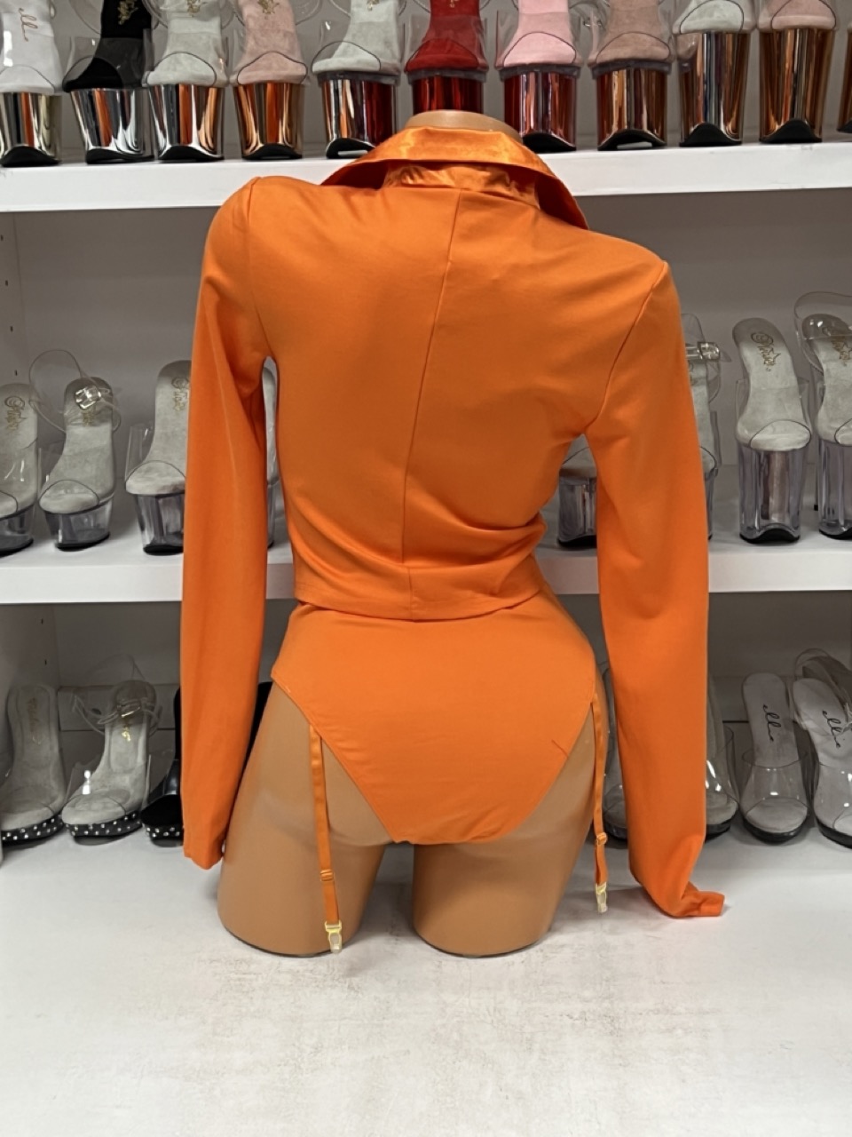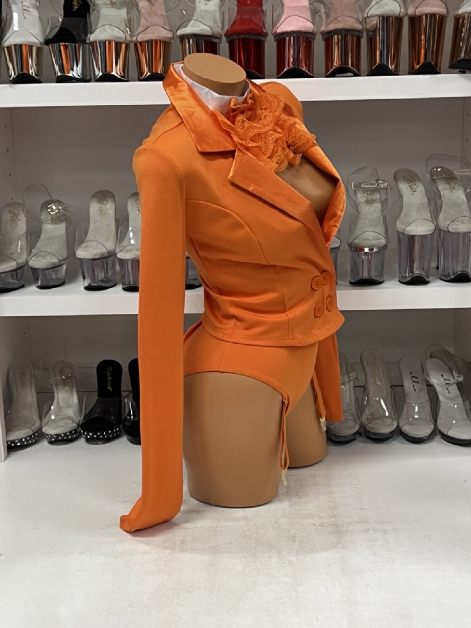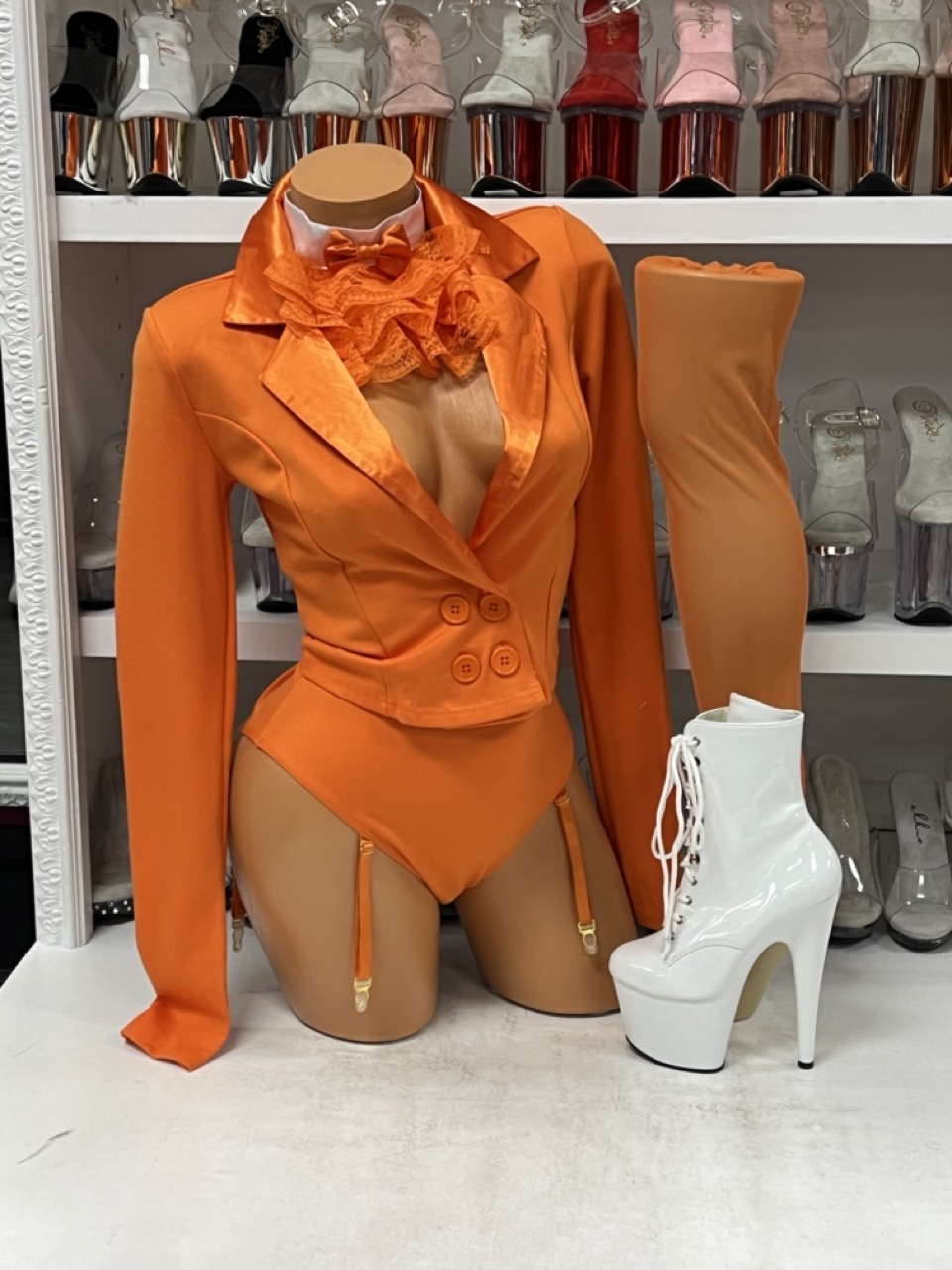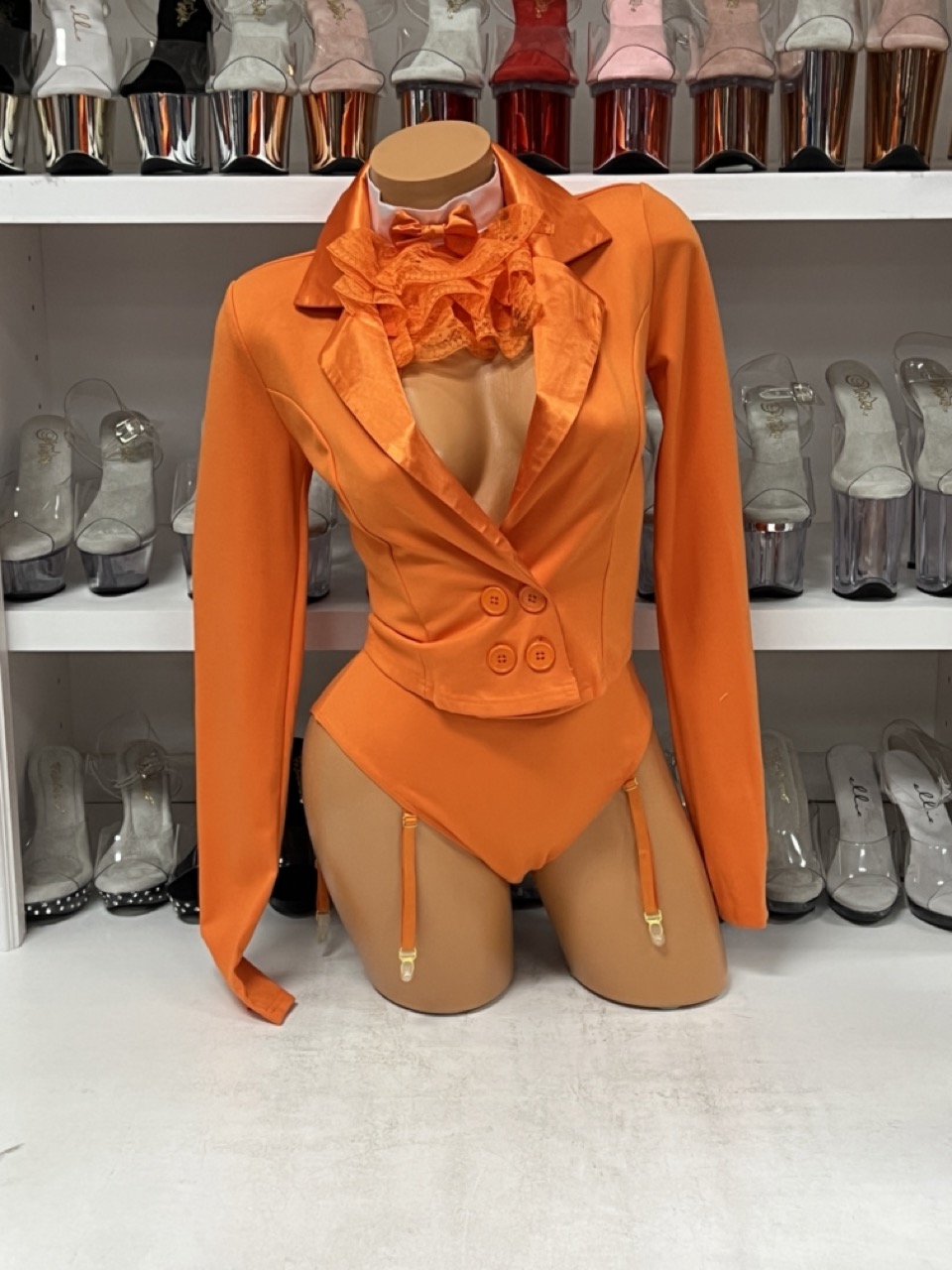 Forplay Orange Tuxedo Costume Set with blazer, ruffle top, shorts, leggings, and hat. Vibrant, structured, and strikingly confident.
