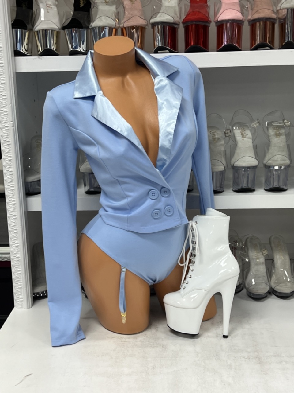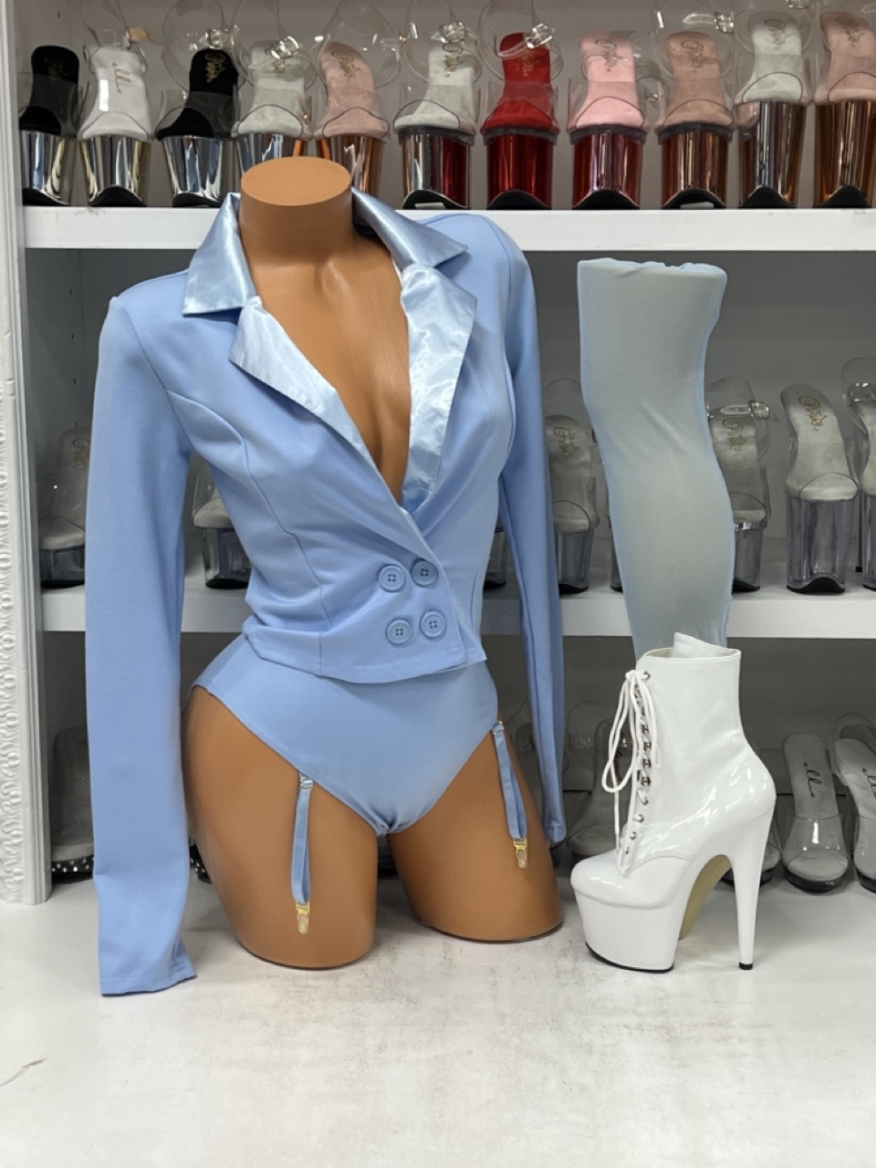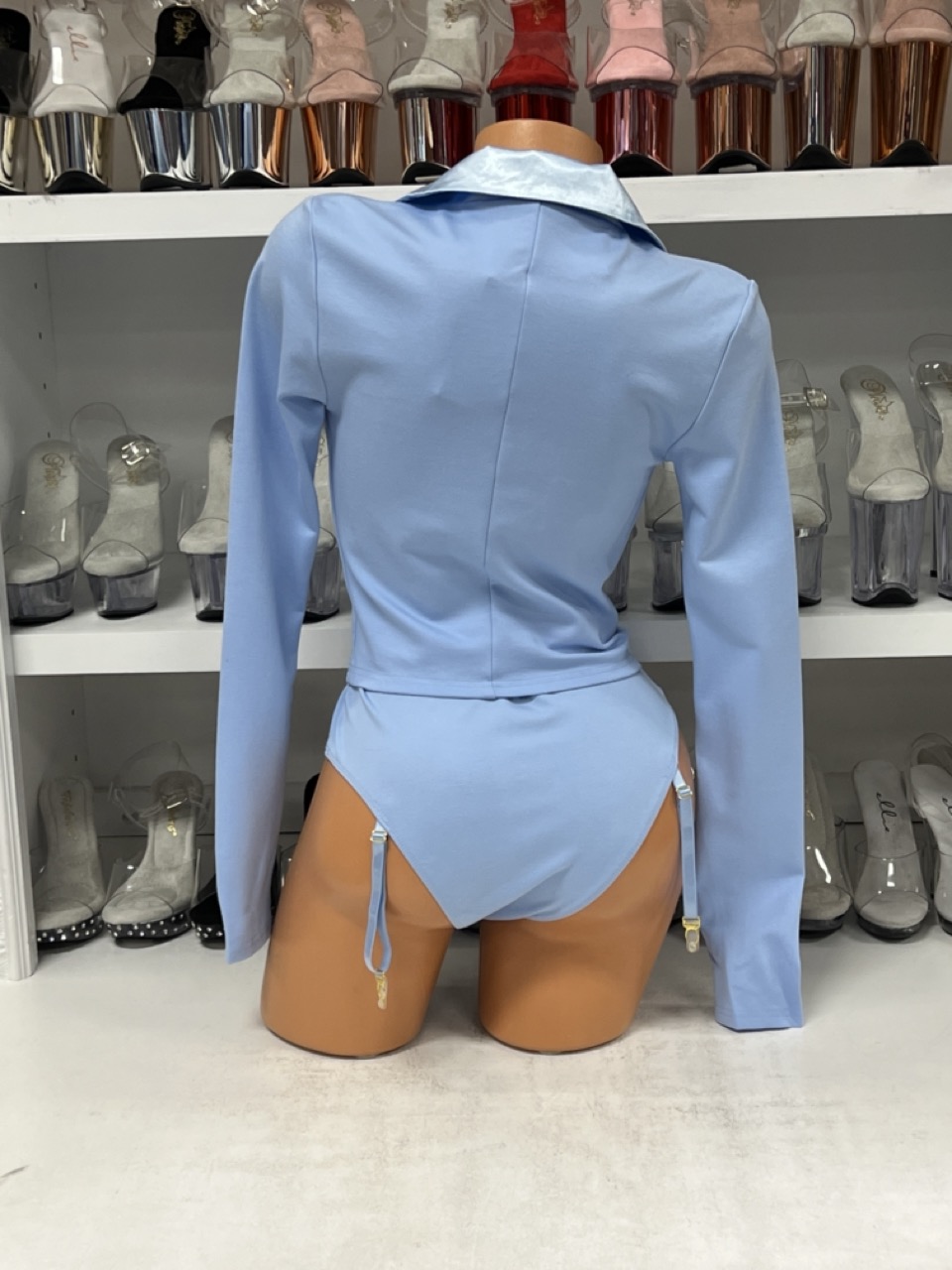 Forplay Blue Tuxedo Costume Set with cropped blazer, ruffle shirt insert, garter leggings, and top hat. Chic, playful, and unforgettable.