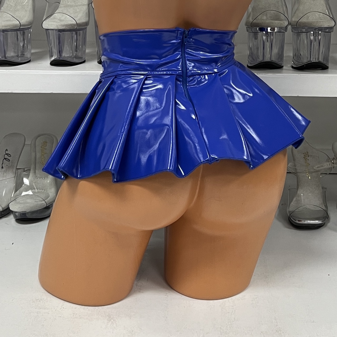 Bold royal blue vinyl pleated mini skirt on mannequin display