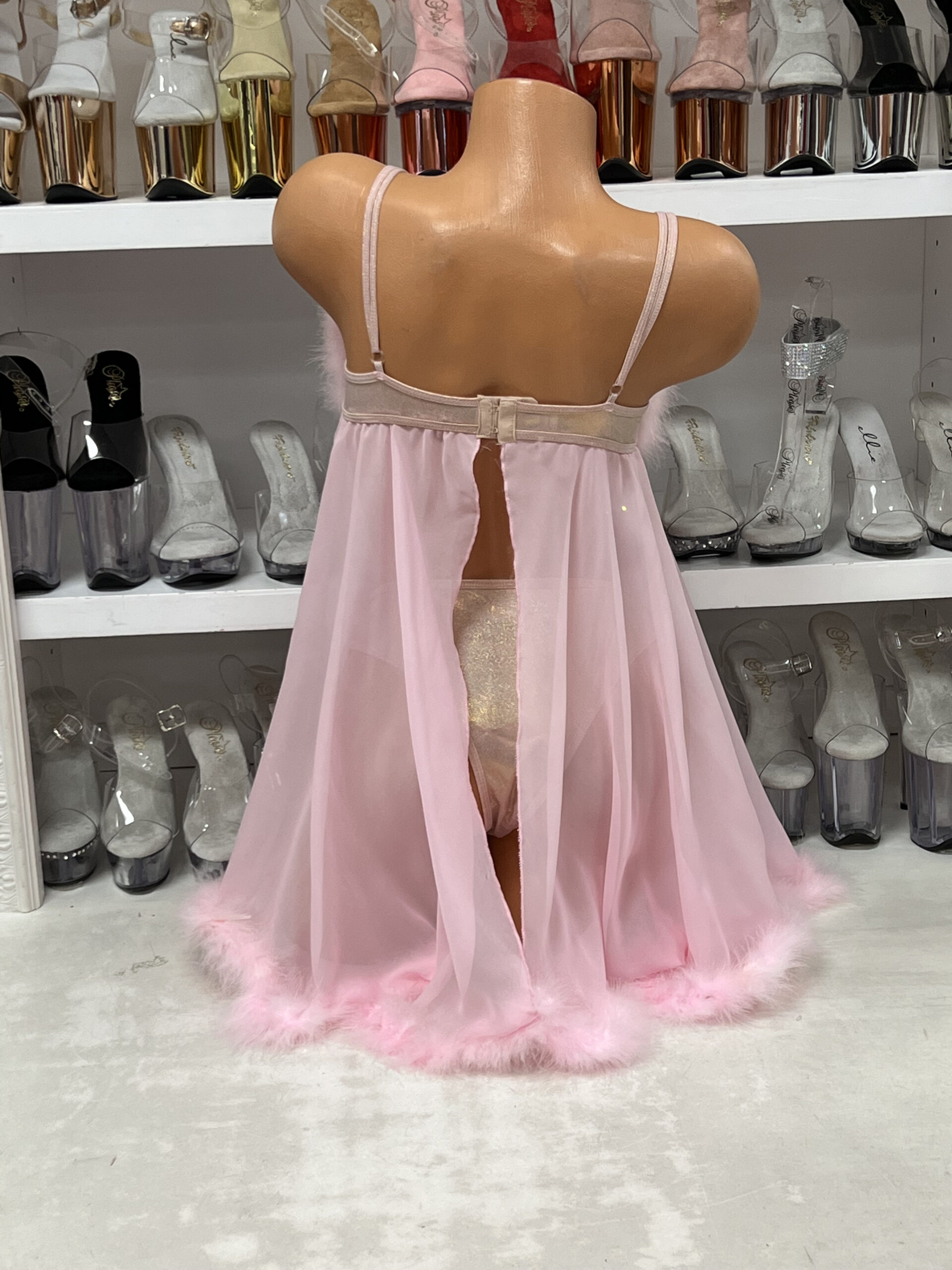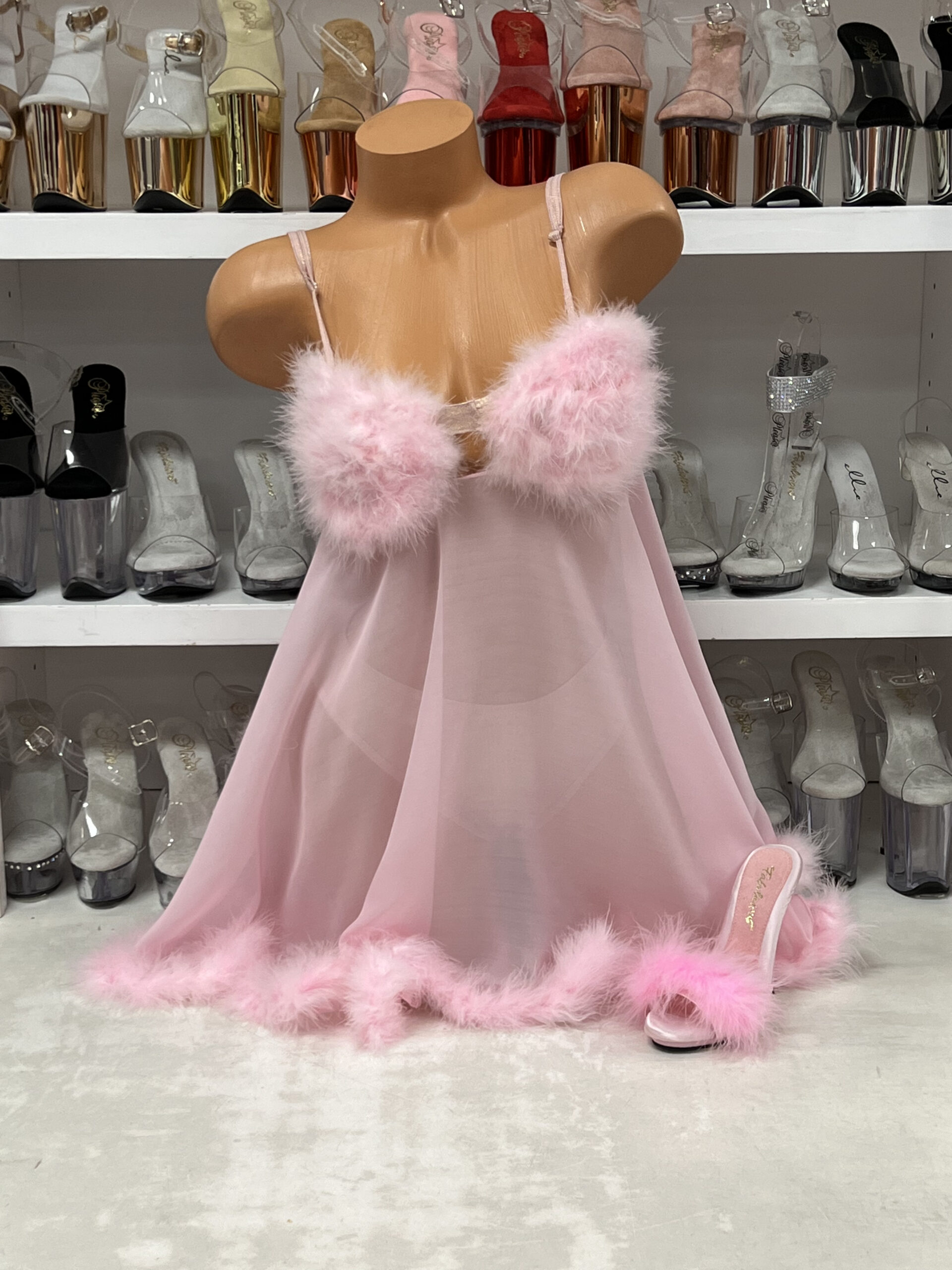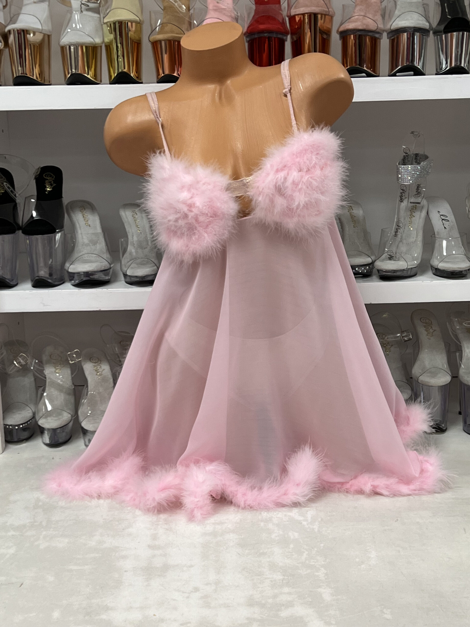 Feel feminine in this furry babydoll dress with marabou cups and hem. This sheer look, paired with metallic gloves and headband, is sure to turn heads. No returns or exchanges.