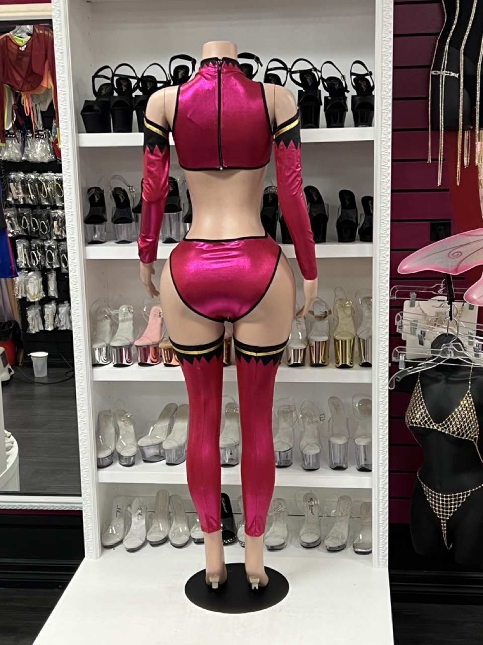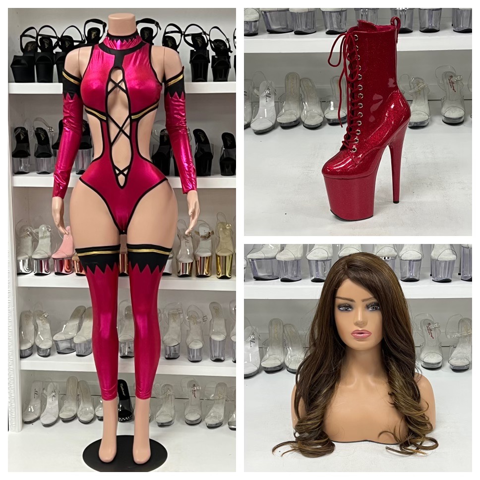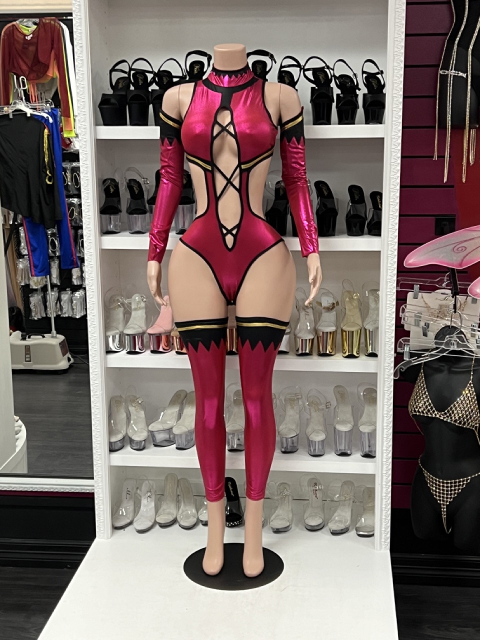 3pc. sexy video game character costume features metallic halter mock neck bodysuit with mid-section side cutout panels, strappy crisscross cut-out center, high-leg, matching opera length gloves and leg accessories. No returns or exchanges.