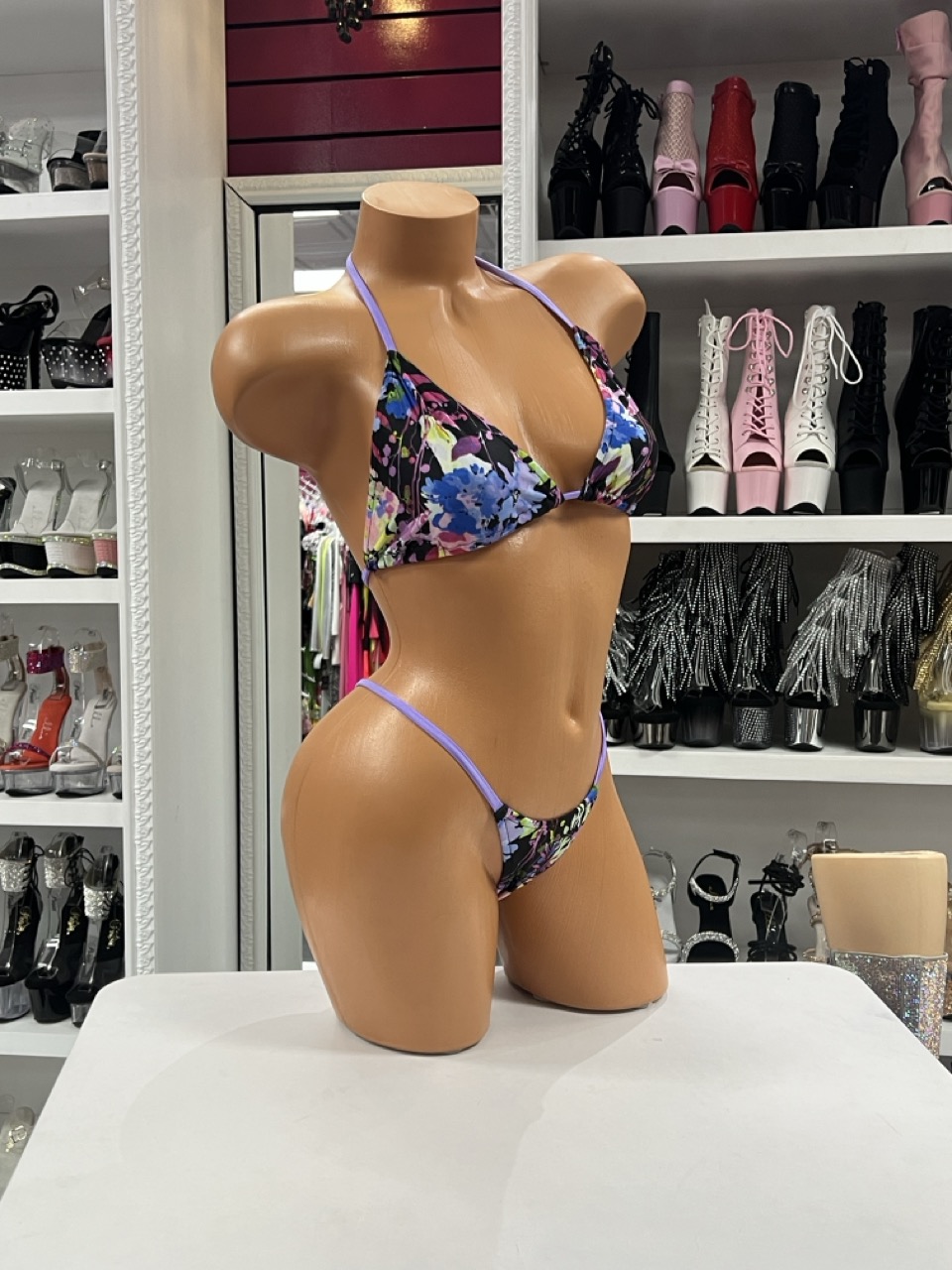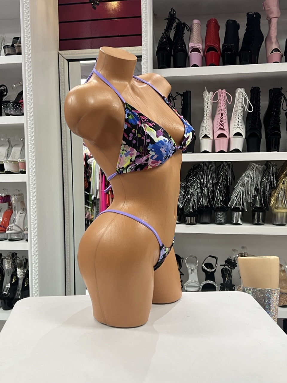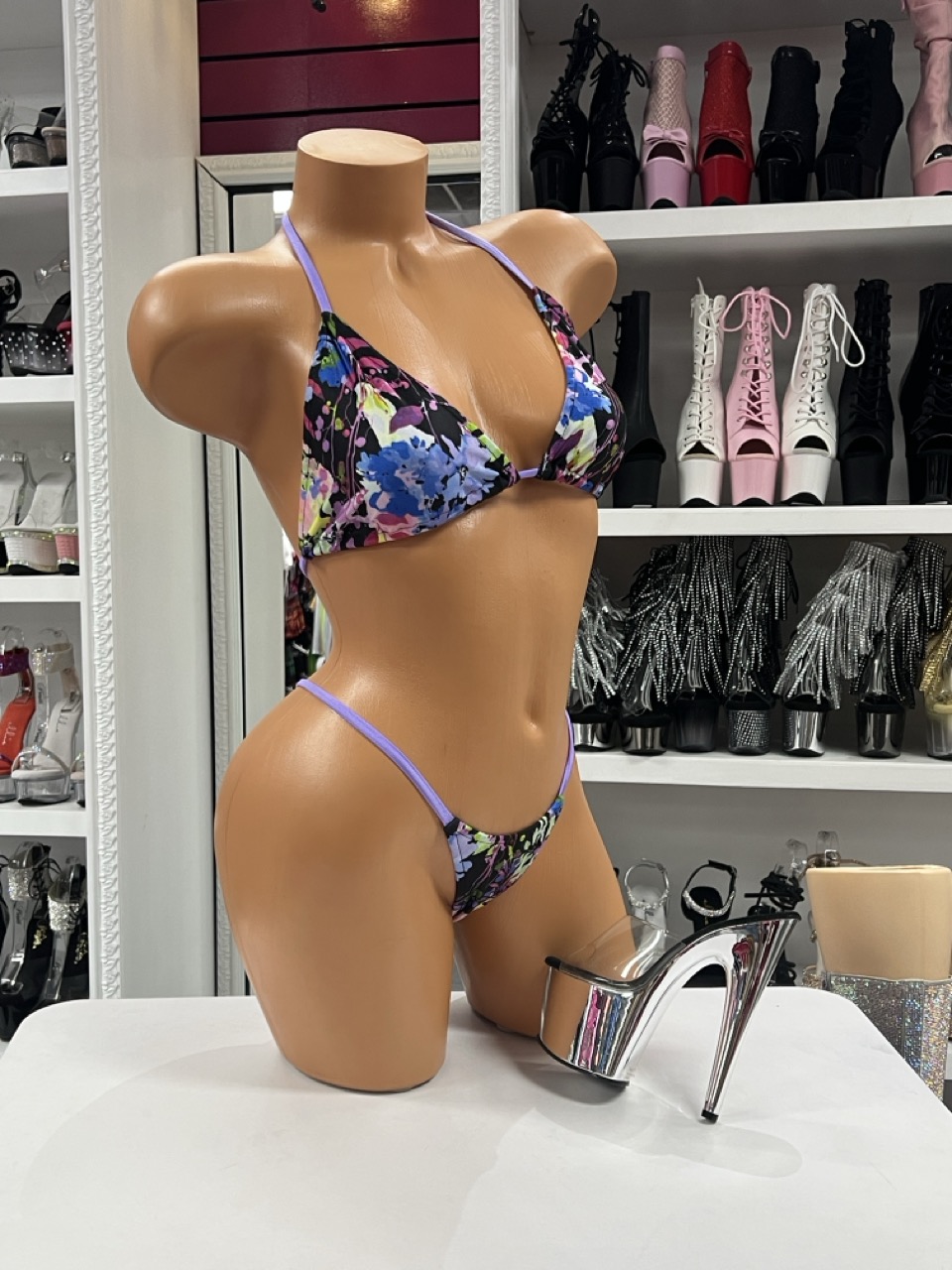 Floral fantasy micro bikini with colorful flower print and purple straps. Playful two-piece set for summer and festivals.