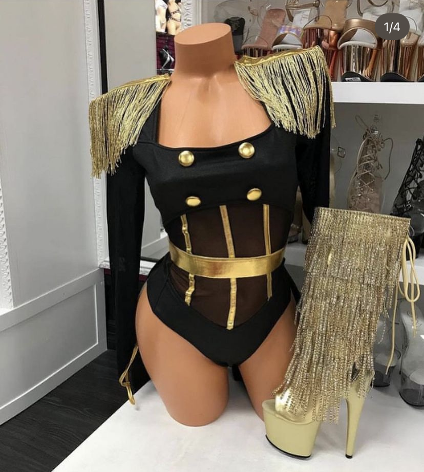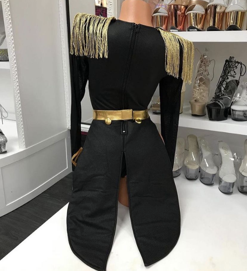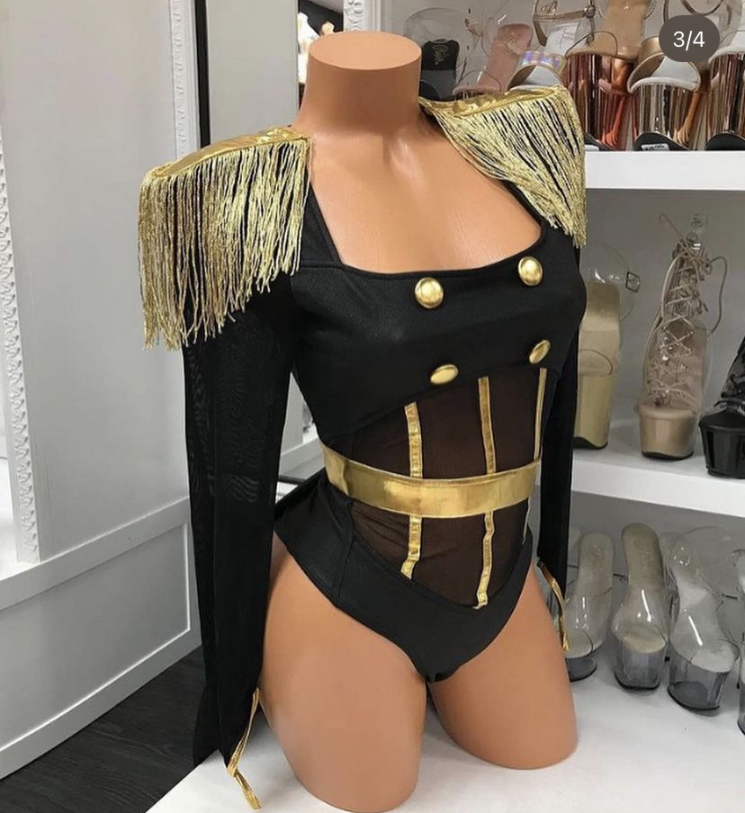 1pc. sexy ringleader costume features tuxedo high-leg bodysuit with long suspended sleeve, coat tails, gold fringe epaulets, gold and black contrast stripes, mesh panels and gold waist belt. No returns or exchanges.
