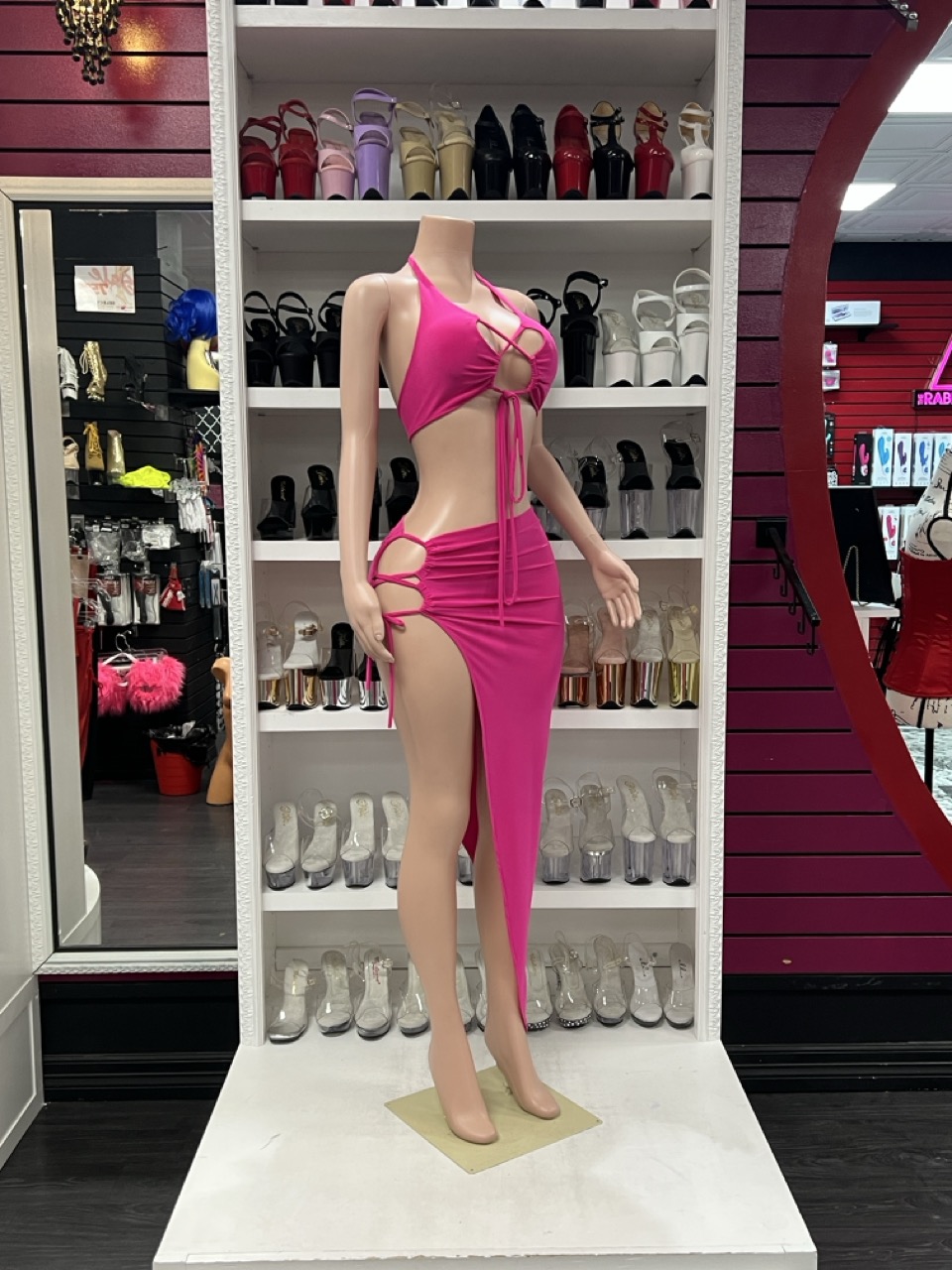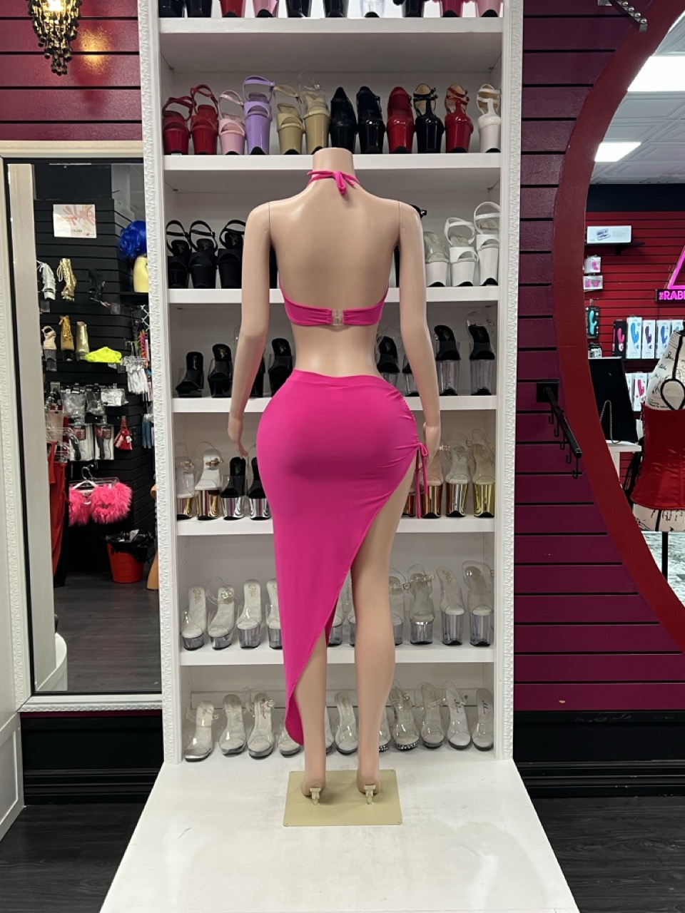 Fuchsia cutout skirt set with halter crop top and high slit skirt on mannequin
