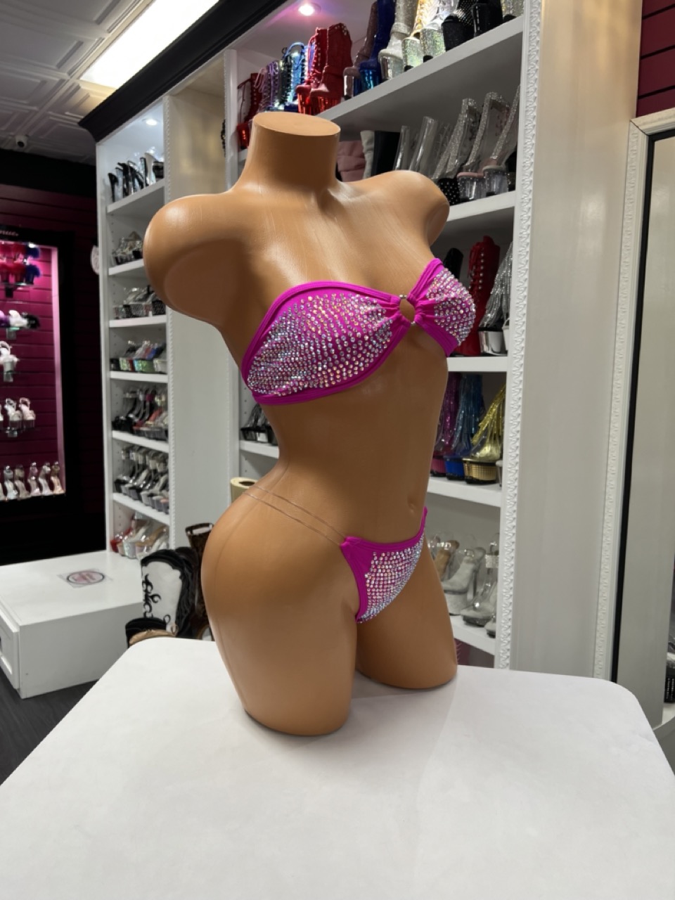 A bold fuchsia bikini set with rhinestones, featuring a strapless bandeau top and high-cut thong bottom.