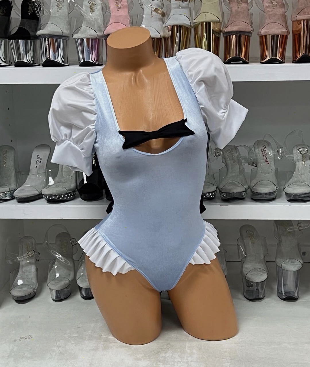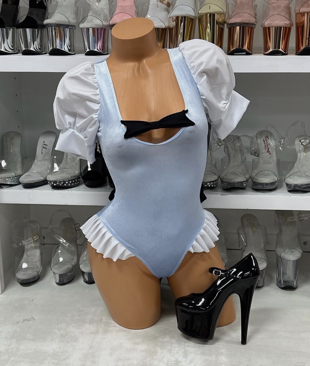 Bring your fairytale to life in the Glass Slippers Costume, a velvet romper with puff sleeves, ruffles, and a bow-tie neckline.