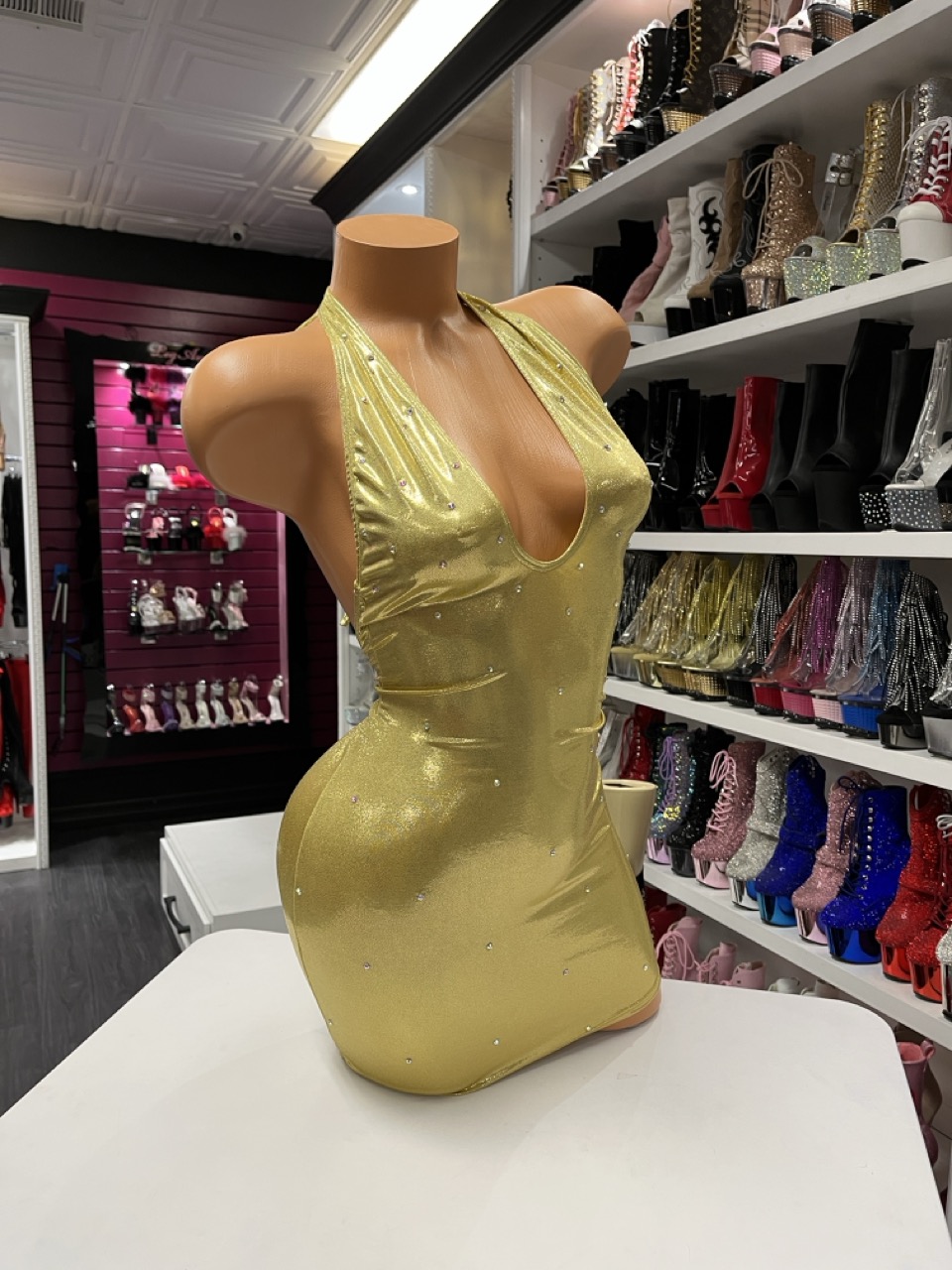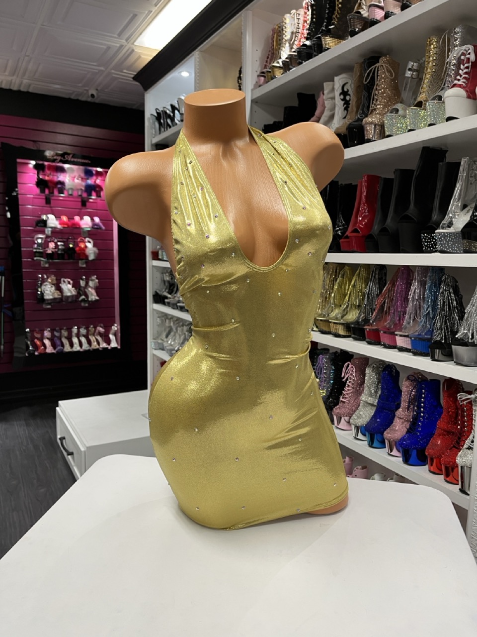 A gold halter mini dress with rhinestone accents and a deep V neckline, designed for nights out and special events.