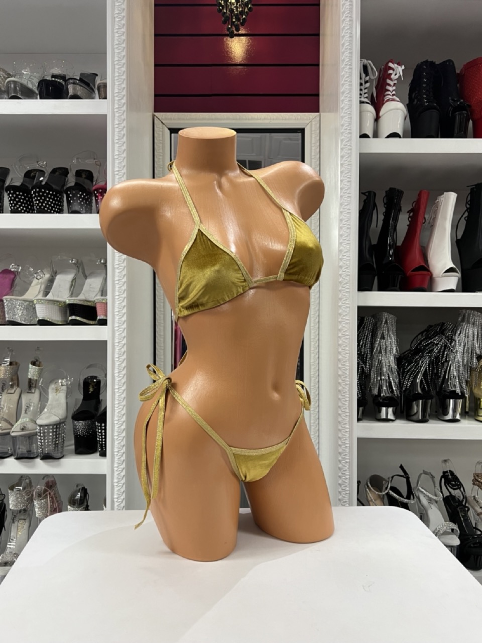 Gold velvet bikini set with adjustable triangle top and tie-side bottoms. Radiant, bold, and perfect for stage or styling.