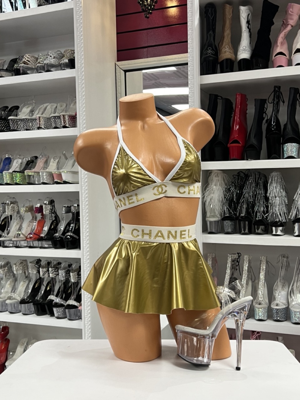 This complete exotic dance set features a gold metallic triangle top with white designer-inspired logo trim and matching flirty mini skirt. The premium materials provide comfort and durability while the adjustable design ensures a perfect fit. Perfect for stage performances, photo shoots, and special events. One size fits most. No returns/exchanges.