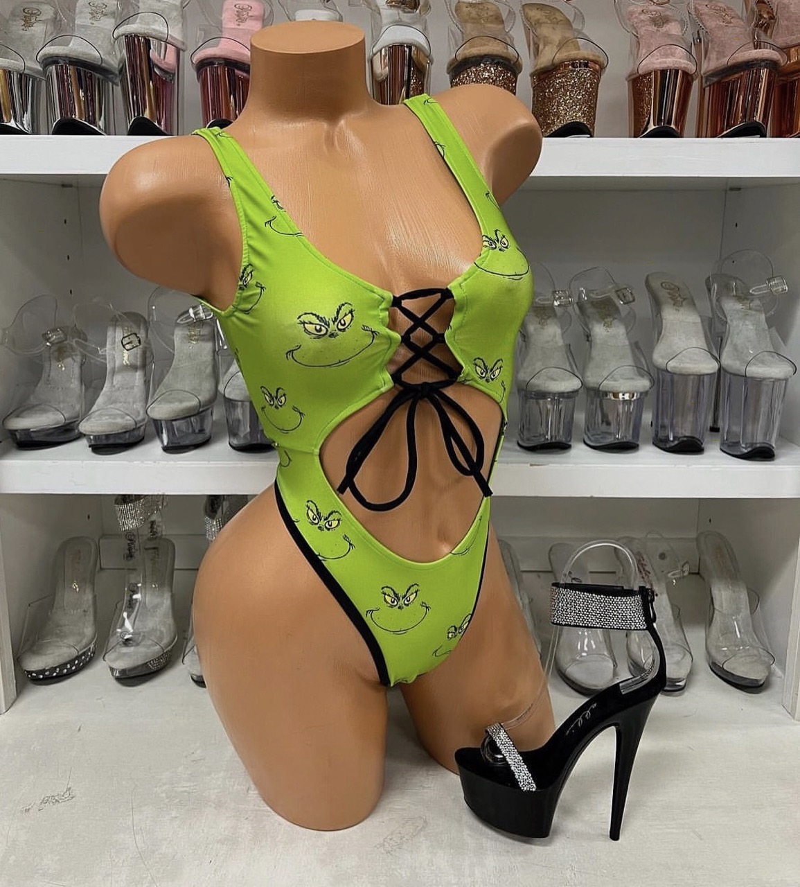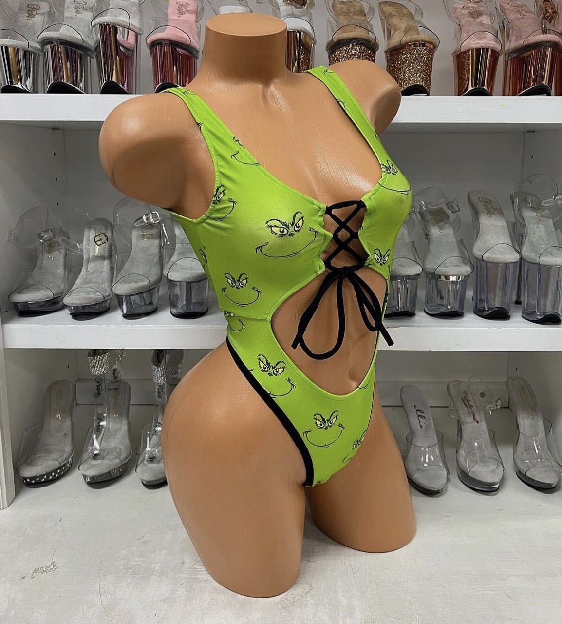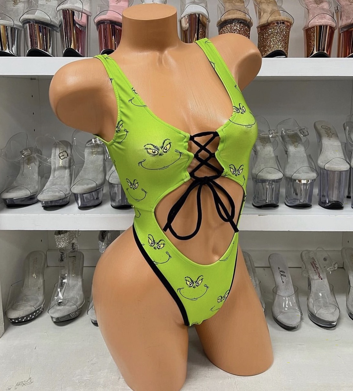 A neon green cutout bodysuit with a lace-up front and playful Grinch-style print. Stretchy, bright, and perfect for dancers or holiday themes.