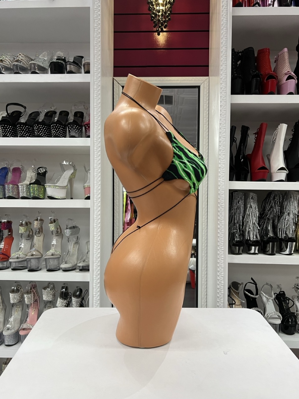 Green lightning micro romper with bold strappy design and minimal coverage. Stretchy, edgy, and made to stand out.