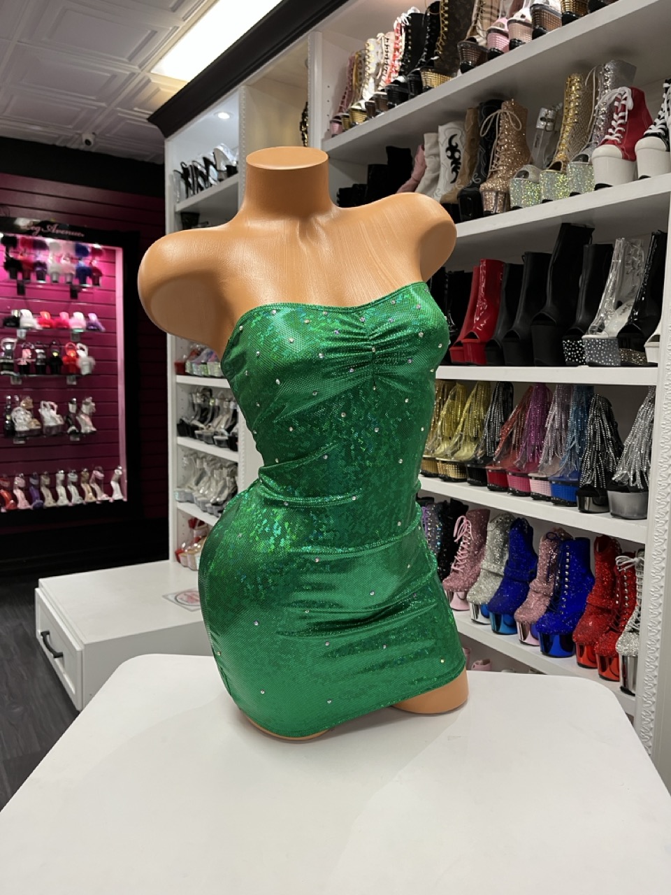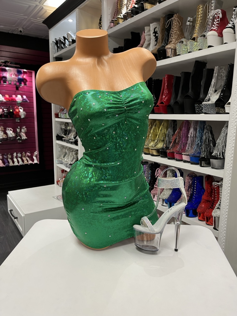 Green strapless rhinestone mini dress on mannequin with clear platform heels