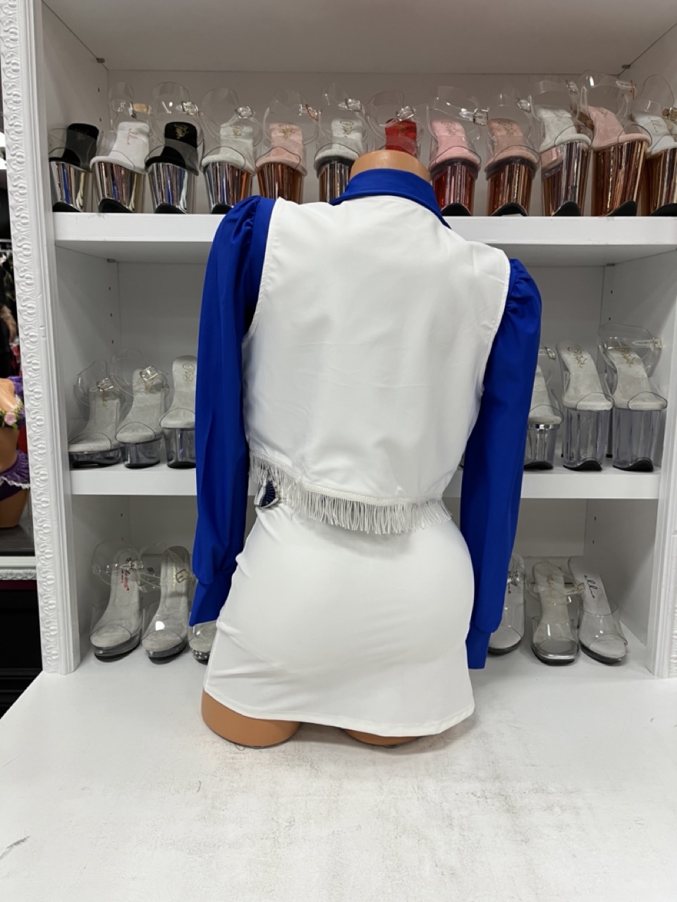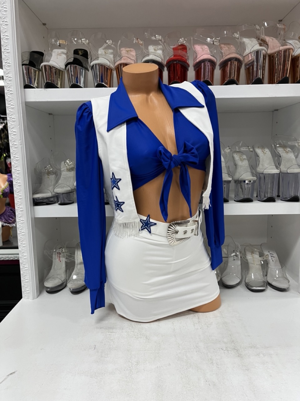 Halftime Show Costume with blue tie-front top, vest, mini skirt, and belt. A spirited cheer-inspired outfit perfect for parties and stage.