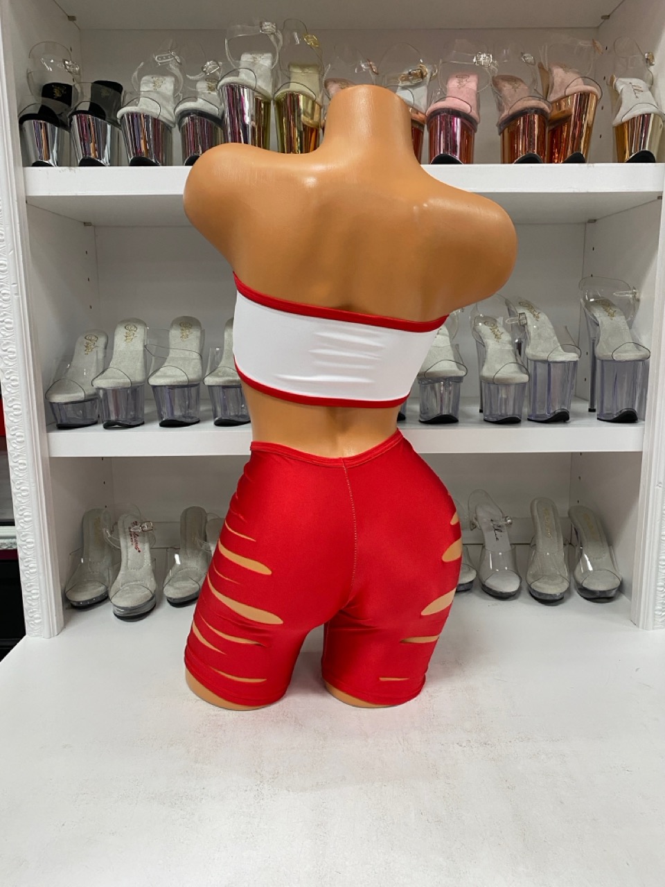 Turn heads in this bold red shorts set featuring a printed bandeau top with a heart and kiss design. The stretchy bandeau offers a snug fit while the matching red biker-style shorts bring the heat with dramatic slashed side details.