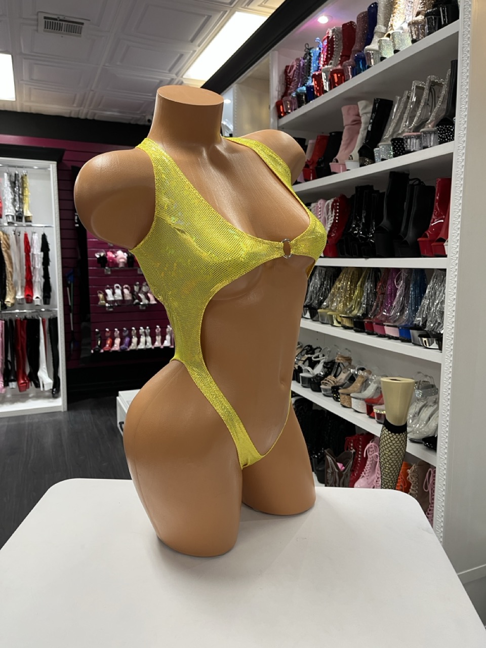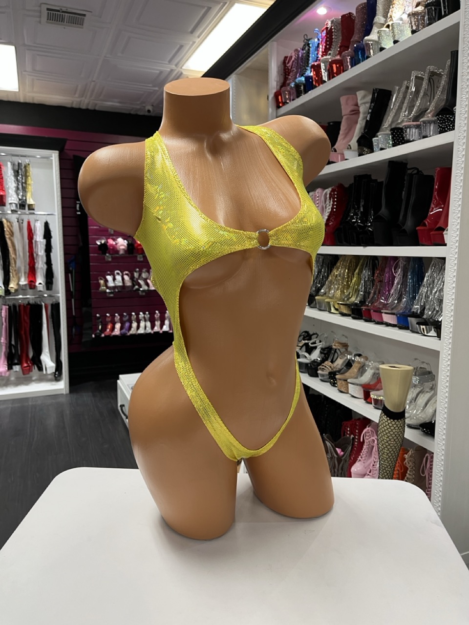 Holographic yellow mesh cutout bodysuit displayed on mannequin for stage wear
