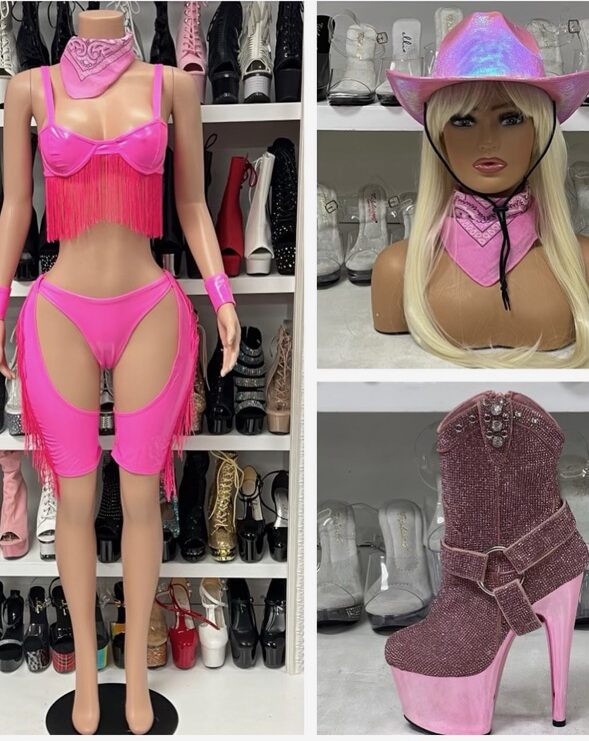hot pink fringe cowgirl costume set with bandana and chaps displayed on mannequin